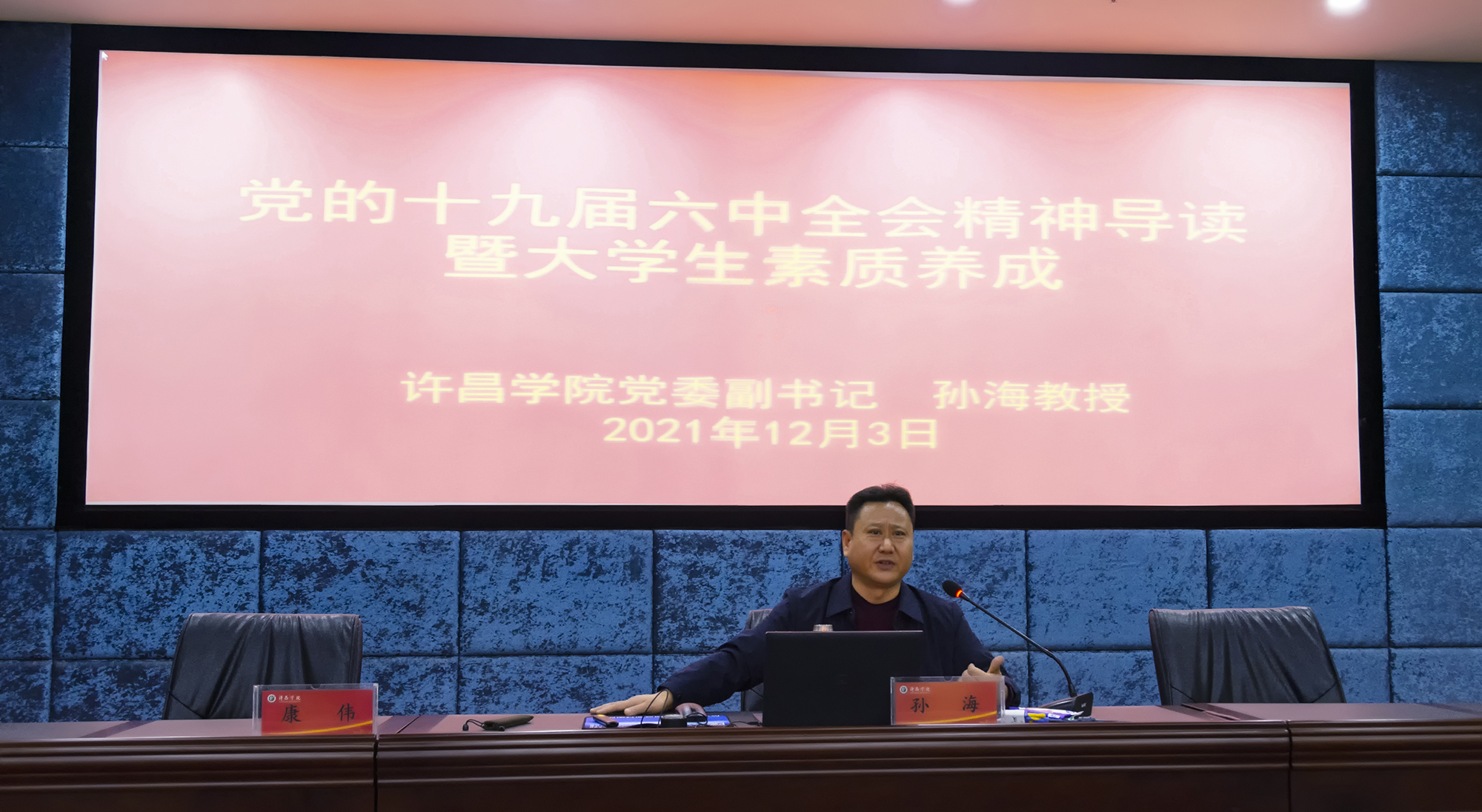 孙海教授从党的十九届六中全会精神导读和大学生素质养成两大部分开展讲座。