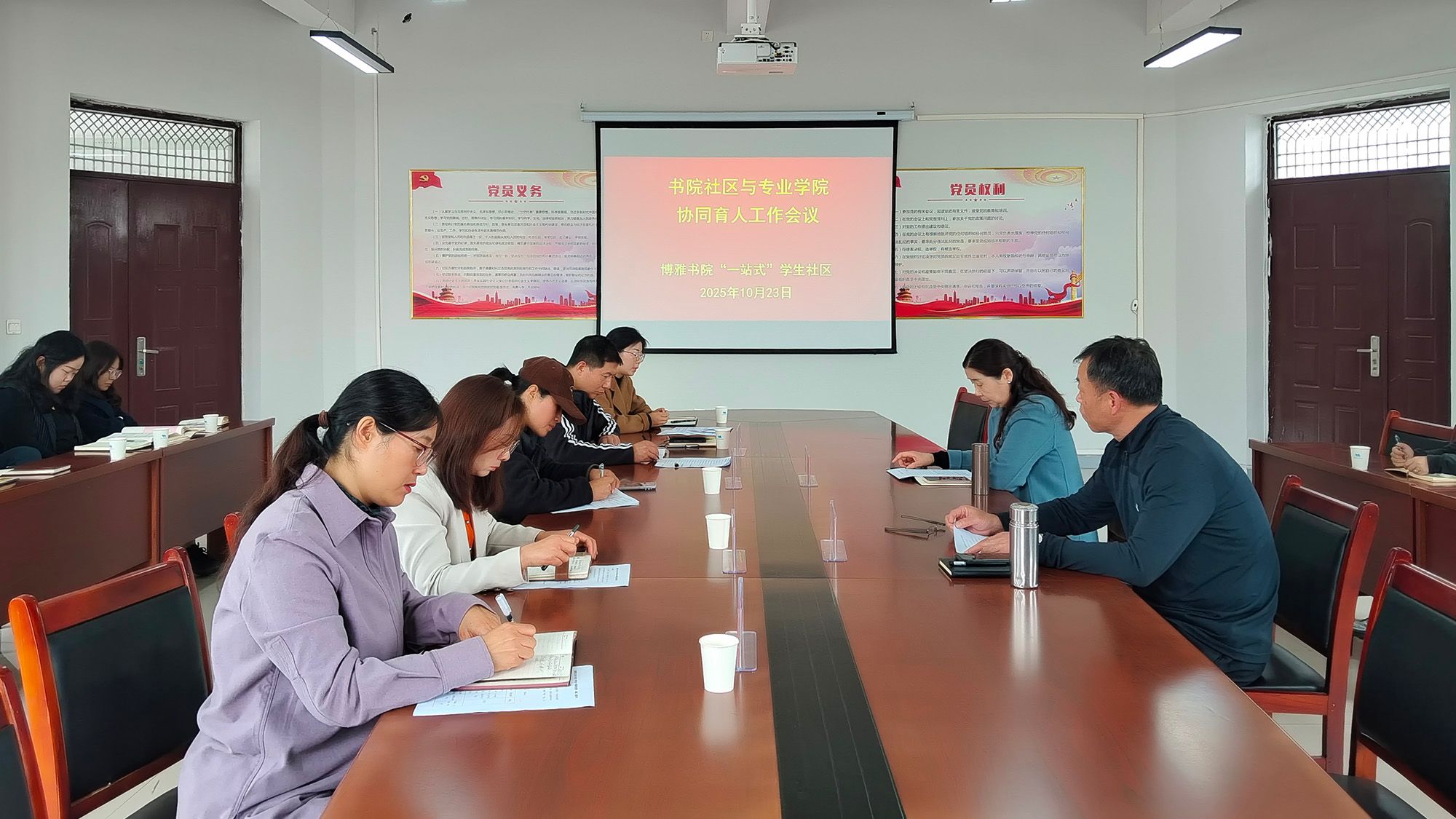 为更好地贯彻落实《高校“一站式”学生社区综合管理模式建设提质增效指南(2025年修订版)》,科学谋划本学期协同育人工作,推动社区与学院协同育人机制的良好运行,10月23日,博雅书院社区会同入住书院社区的专业学院召开本学年第一次协同育人工作会议。博雅书院社区班子成员、科级干部,外国语学院、体育学院、医学院党委副书记、教学副院长、团委书记等参加会议。博雅书院院长王建民主持会议。