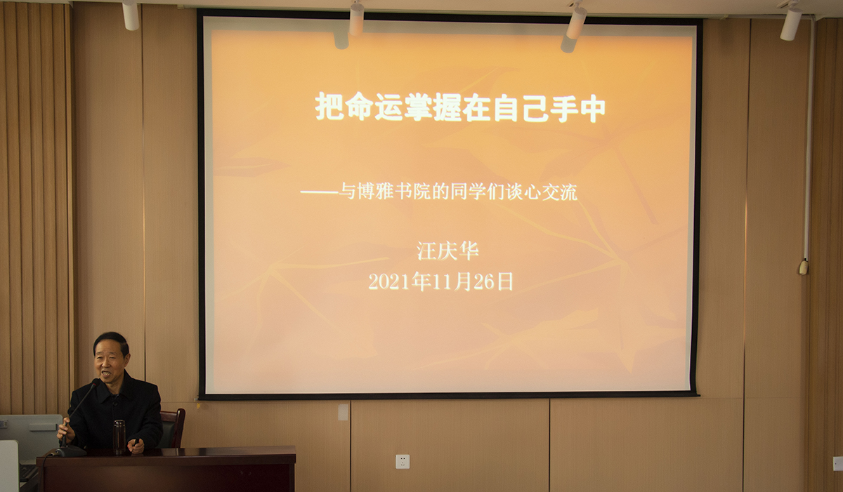 11月26日,博雅书院特邀中原农耕文化博物馆名誉馆长、中原农耕文化研究中心主任、学校关工委副主任汪庆华教授到博雅讲堂做题为《把命运掌握在自己手中》的讲座。博雅书院、医学院副院长牛磊和同学们一起聆听了讲座。
