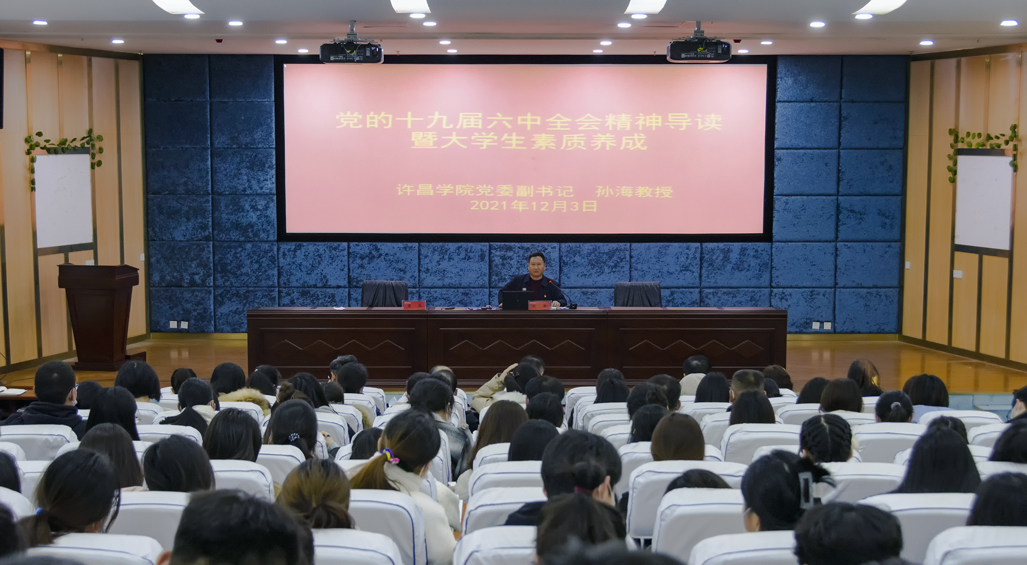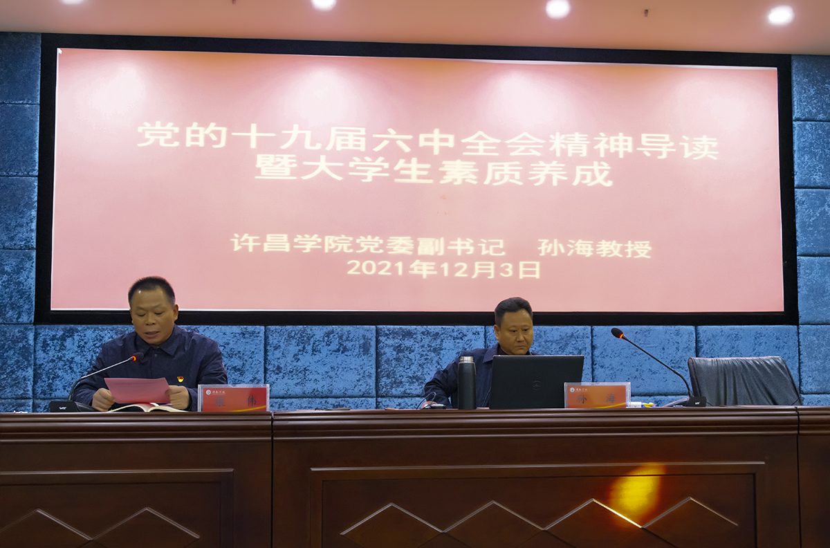 孙海教授从党的十九届六中全会精神导读和大学生素质养成两大部分开展讲座。