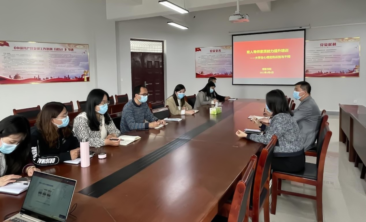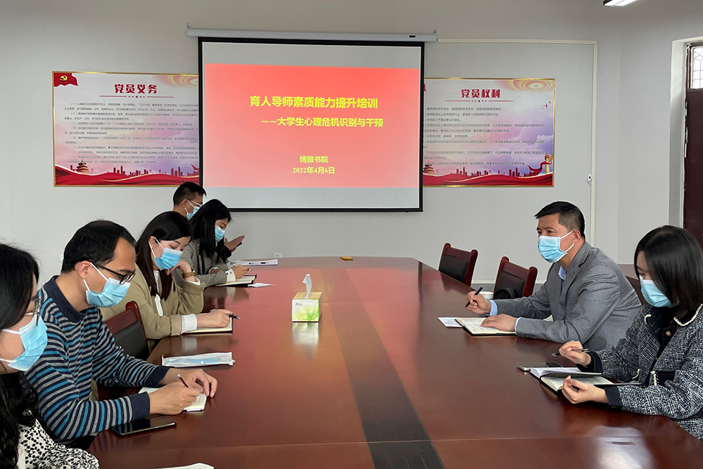 4月6日,我院在201党建活动室举办博雅书院第二期育人导师素质能力提升专题培训——大学生心理危机识别与干预。医学院党委副书记,博雅书院党委副书记、副院长陶战刚及全体育人导师参加会议。