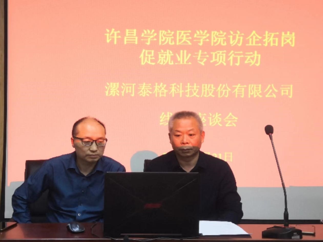 4月21日下午,与漯河泰格科技股份有限公司总经理吴英进行了线上座谈。会上,医学院领导向漯河泰格科技股份有限公司重点推介本届毕业生,希望公司为他们提供更多适宜的岗位,共同促进毕业生高质量就业;还就校企合作、人才培养提出设想和方案。