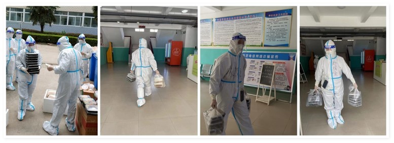 面对疫情,校本部的博士、教授、处长听从党委命令,踊跃报名参加志愿服务,忘却领导职务,穿上防护服,化身兴华路校区“大白”搬运工服务员,为被隔离在5栋宿舍楼中的一千多名学生“快递”一日三餐和生活用品。每天的三个饭点,这群“大白”搬运工服务员都会按时为一千多名学生配送饭菜。按照防疫规定,每天的饭菜都要送到每个宿舍门口。没有电梯,“大白”搬运工服务员需要将饭菜手抬肩扛运到5楼,每层走廊长近百米。配送物资不仅是一日三餐不重样,还有牛奶、水果、方便面、中药液,并负责清理运出各种生活垃圾,工作量可想而知。这群“大白”服务员平均学历为硕士研究生以上,平均职称为副教授以上,平均职务为副处长以上,平均年龄在45岁以上,大多鬓已斑白......这群“大白”服务员不辞劳苦、汗流浃背的身影、牺牲奉献的忘我精神,感动着指挥长,也感动、激励着被封控在宿舍内的莘莘学子。
