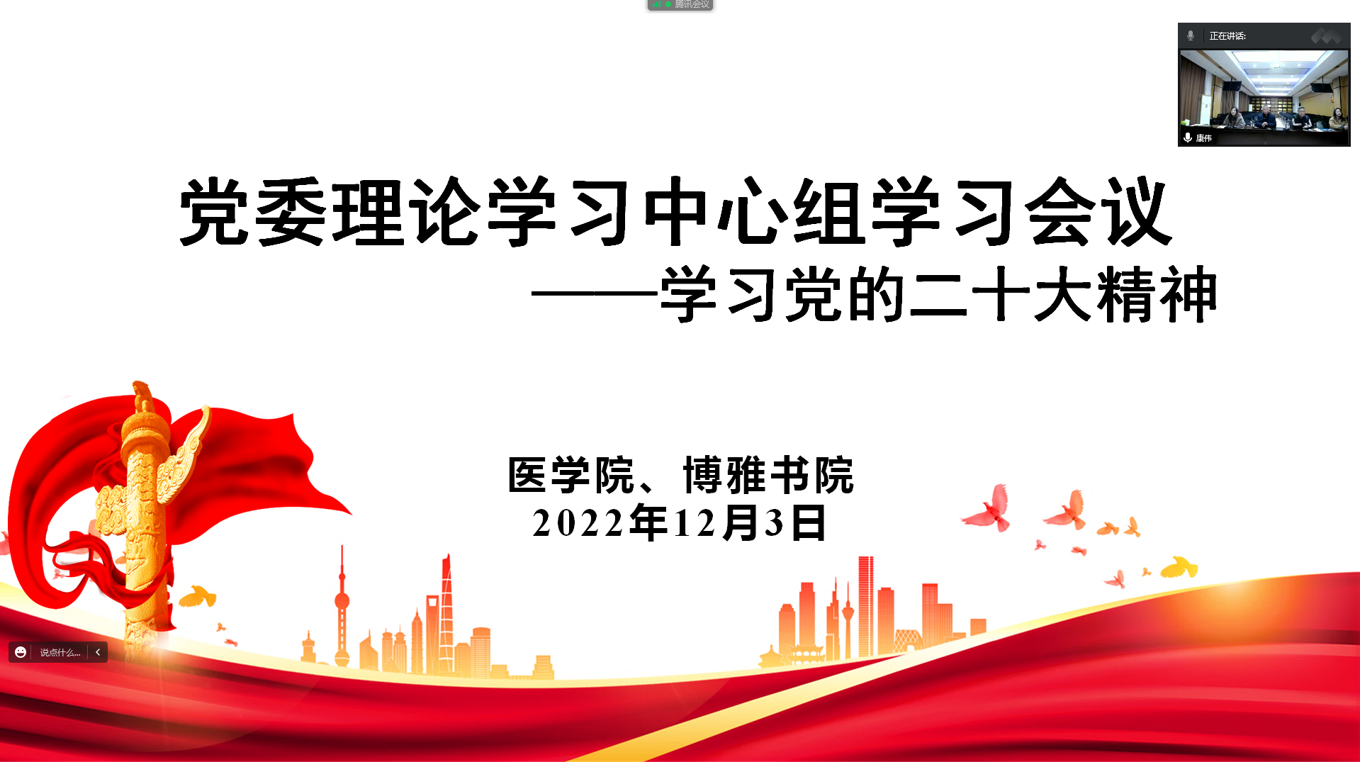 12月3日下午,医学院、博雅书院党委召开党委理论学习中心组(扩大)学习会议,专题学习党的二十大精神。会议采取线上线下相结合形式召开,由兴华路校区管理委员会常务副主任兼医学院党委书记、博雅书院党委书记、院长康伟主持,医学院、博雅书院领导班子、科级干部、辅导员参加会议。