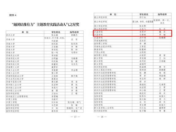 4月10日中共河南省委教育工委办公室、河南省教育厅办公室公布了“越团结豫有力”主题教育实践活动获奖结果,我院师生在活动中获得多项荣誉,20级护理专业学生陈胜楠所创作的作品荣获活动“优秀作品奖”,22级法学专业学生李思宇、21级护理专业学生马青峰所创作的作品荣获活动“人气之星”,辅导员魏笑、罗楠被评为优秀指导老师。