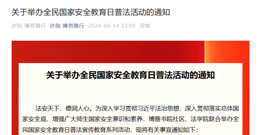 2024年4月12日-19日,为深入学习贯彻习近平法治思想,深入贯彻落实总体国家安全观,增强广大师生国家安全意识和素养,博雅书院社区、法学院联合举办全民国家安全教育日普法系列活动。
