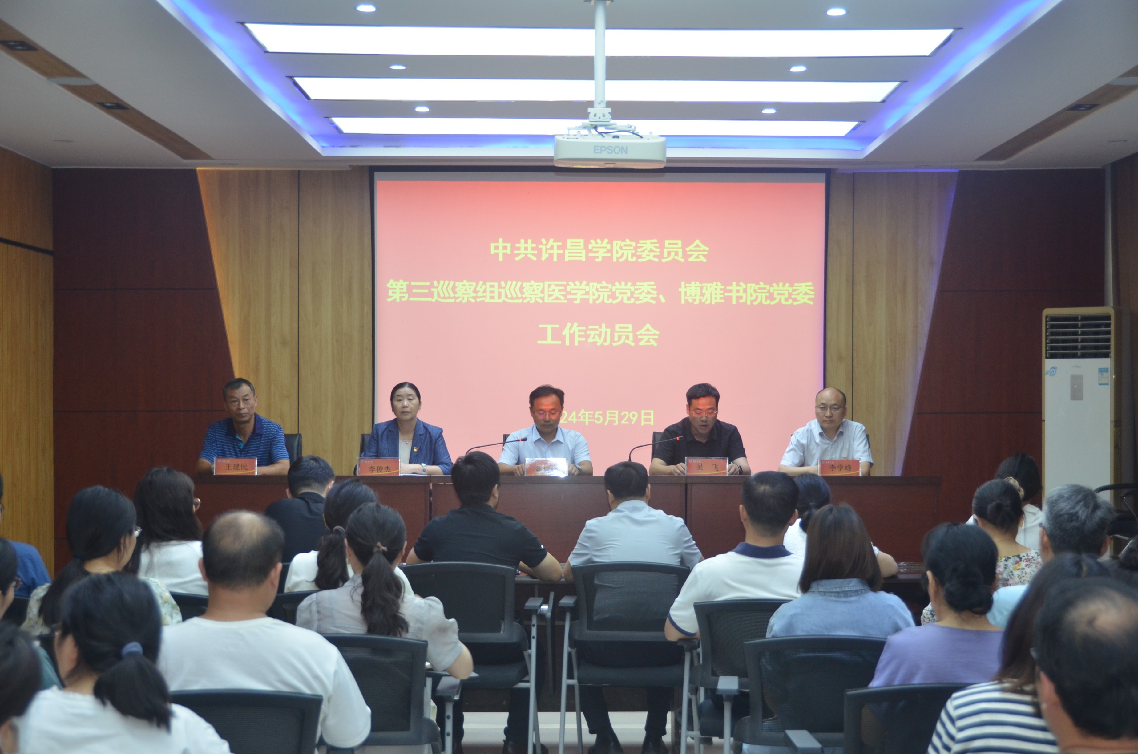 2024年5月29日下午,校党委第三巡察组巡察医学院党委、博雅书院党委工作动员会在兴华路校区B楼第一会议室召开。校党委第三巡察组组长姚向峰,副组长屈鑫涛、谢智宇,成员谭芳丽、马琳展、贾琳、贾依航出席会议,医学院、博雅书院全体教职工参加会议。会议由医学院党委书记吴飞主持。