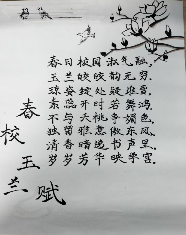 活动期间,同学们或齐聚玉兰花下,声情并茂地朗诵以玉兰为主题的经典诗词,在诗词的韵律中,深刻感受中华优秀传统文化的魅力。或围绕“玉兰花”“春日”“春景”“春思”“春游”等主题,创作传统诗词、藏头诗或藏尾诗,展现玉兰之美,感受春日诗意,并发挥创意,运用绘画、剪纸、书法等多种形式,将诗词誊写或绘制在书签上,一枚枚精美的书签不仅展现了他们的文学才华,更传递出对自然之美和诗词之韵的独特感悟。或通过镜头捕捉校园玉兰的美丽瞬间,一幅幅精彩的作品生动展现了玉兰的迷人风采和校园生活的点滴美好。或阅读经典文学作品,并分享读书心得,感受文学魅力,提升人文素养。或围绕玉兰主题挥毫泼墨、精心创作,展现书画艺术的独特魅力,传承了中华艺术文化。