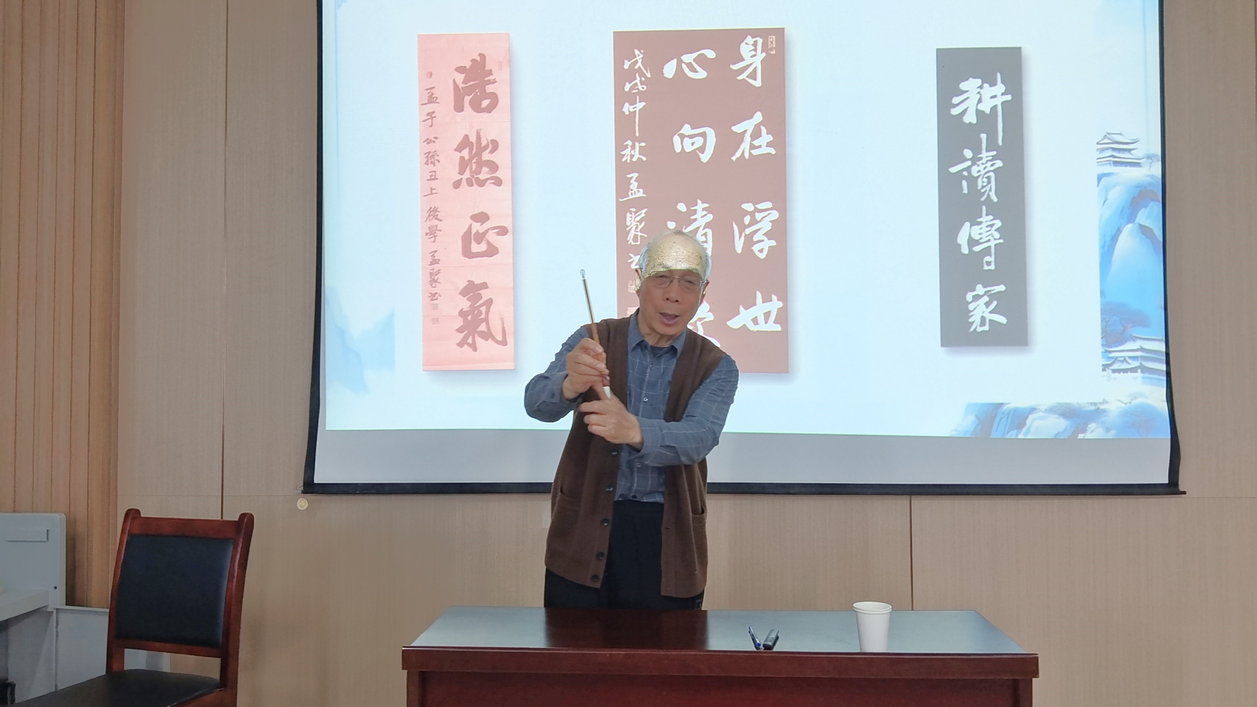 在了解同学们书法能力后,孟聚教授以《漫谈书法学习》为题开展专题讲座,讲座在博雅讲堂举行。孟聚教授分享了书法学习知识,结合他的书法创作,以图片形式向同学们展示了多幅书法作品。他强调了书法在中国传统文化中的重要地位,研习书法和书法创作的重要社会作用。孟教授重点讲解了“文房四宝”笔墨纸砚的演变,如何选择合适的毛笔,介绍了宣纸和墨汁的种类,示范了毛笔的正确执笔方法。结合同学们的书写情况,孟教授讲了书体、书法字帖的特点以及如何选择书体临帖,强调初学书法一定要从临帖开始。
