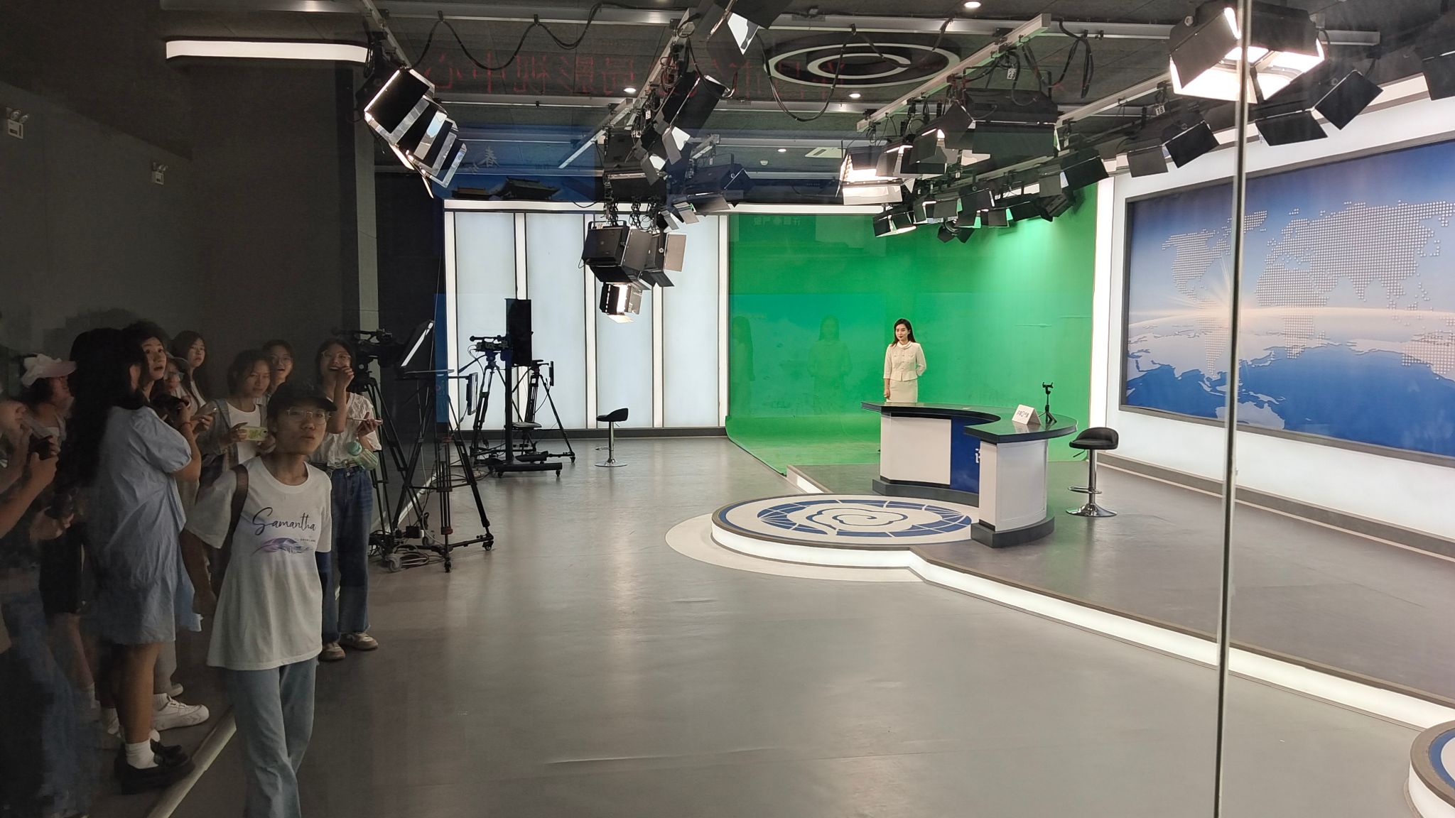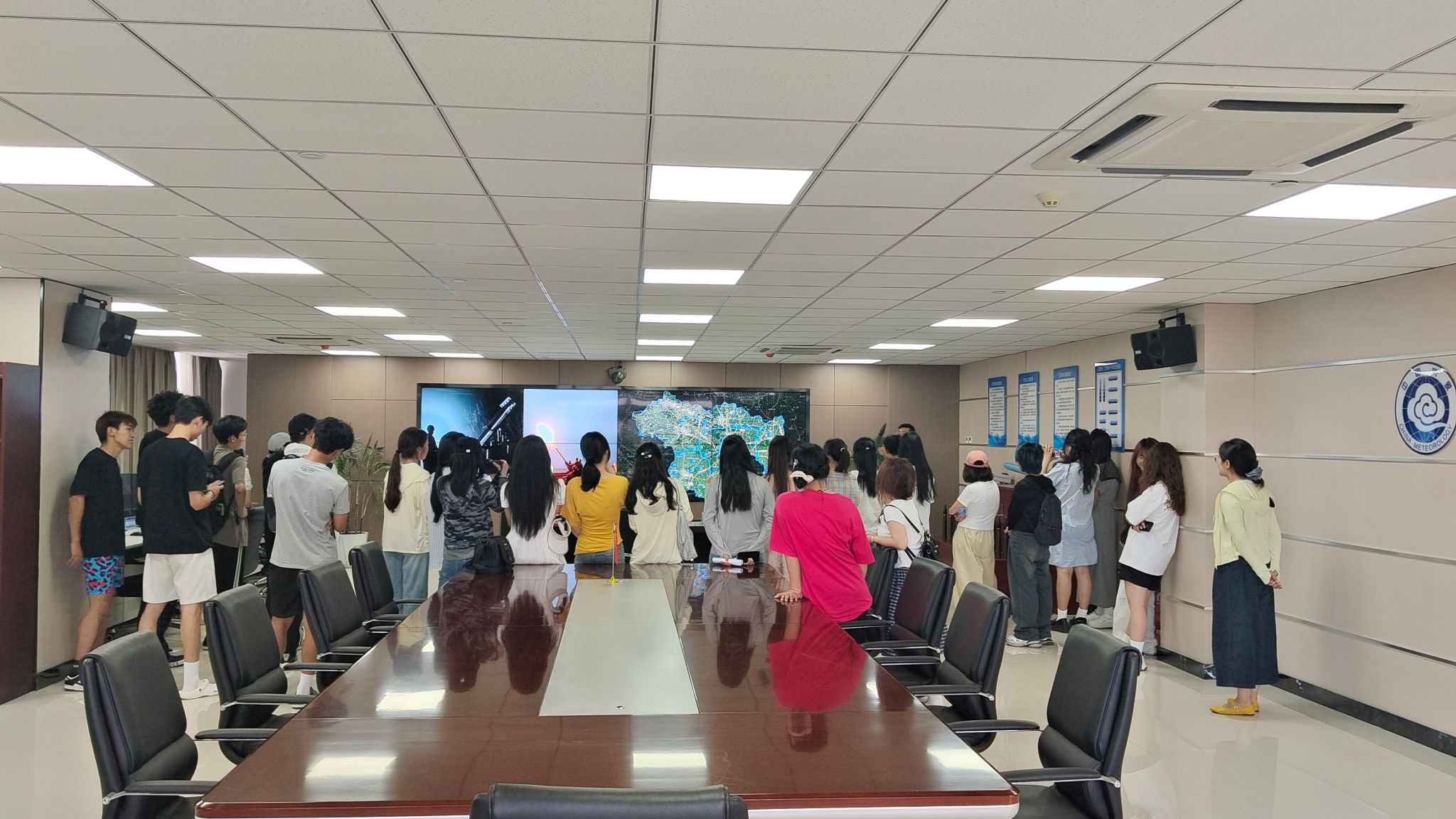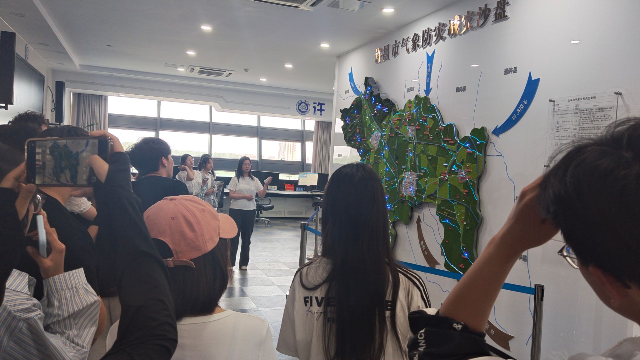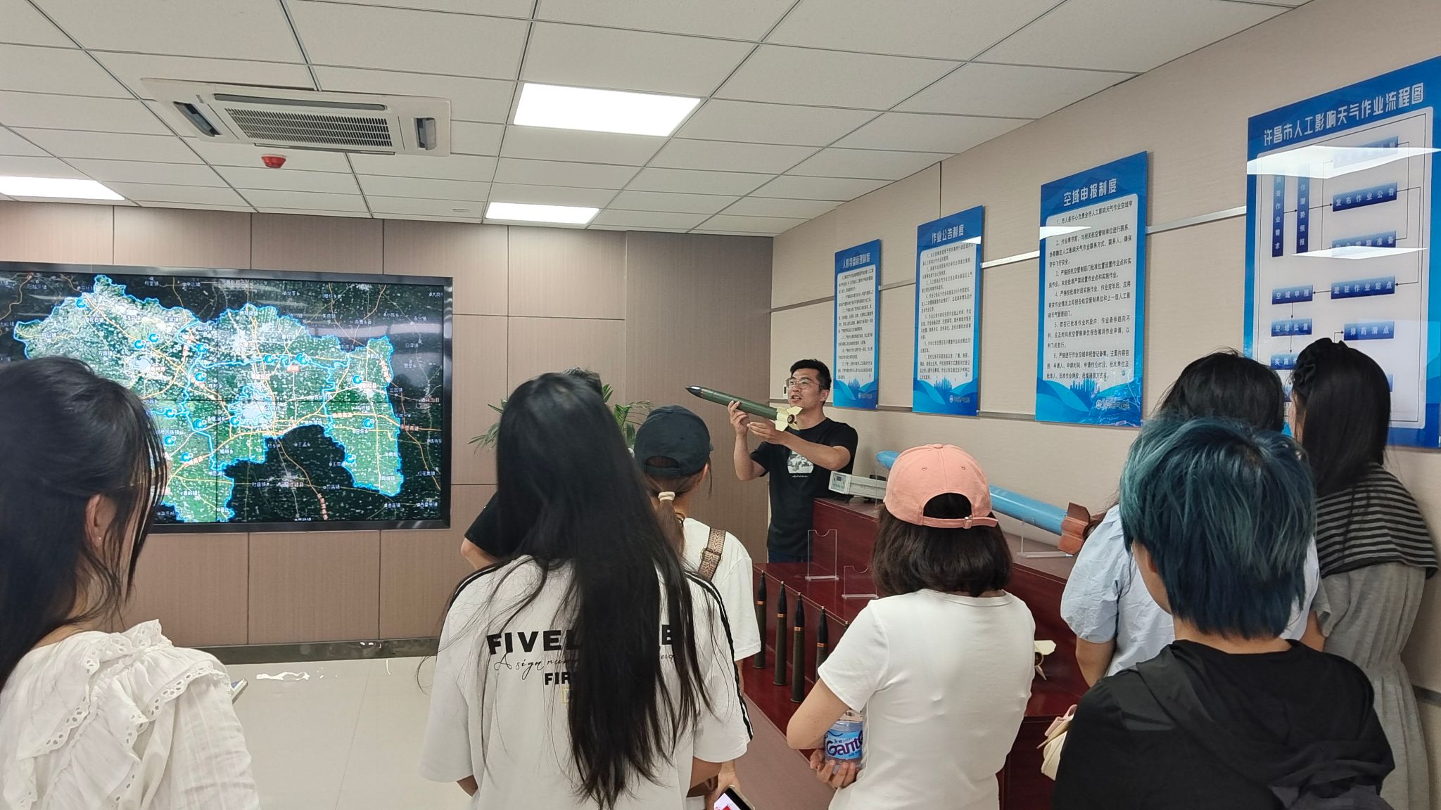 在许昌市气象局李晓凯主任的带领下,同学们参观了气象科普馆雷达塔楼、气象预警信息发布中心、人工影响天气指挥中心、气象影视中心等业务场所,市气象局的专家们为同学们介绍了雷达的工作原理、气象预警信息的预报及推送、人工增雨的流程及作业点分布、天气预报影视的录制等专业气象知识。在参观过程中,同学们就一些特殊天气现象提出问题,气象专家一一作了解答。在气象影视中心,按照气象局专家的要求,同学们走进演播录制大厅,体验了天气预报主持人的工作。