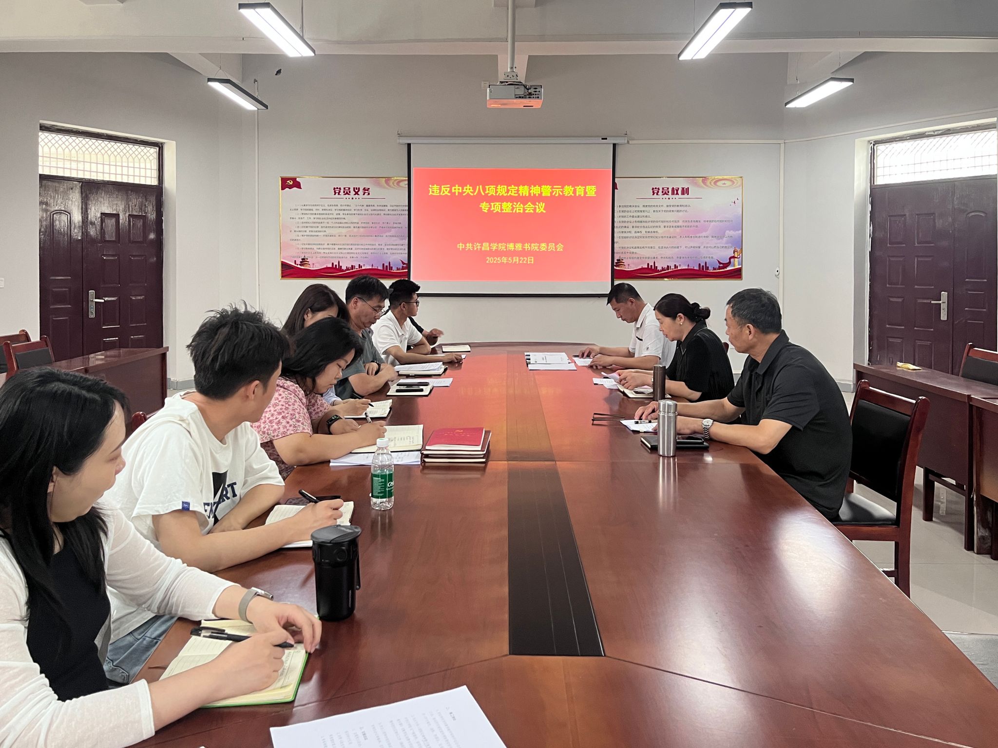 5月22日上午,我书院社区在党建活动室召开违反中央八项规定精神警示教育暨专项整治会议,会议由党委书记李俊杰主持,全体教职工参加会议。