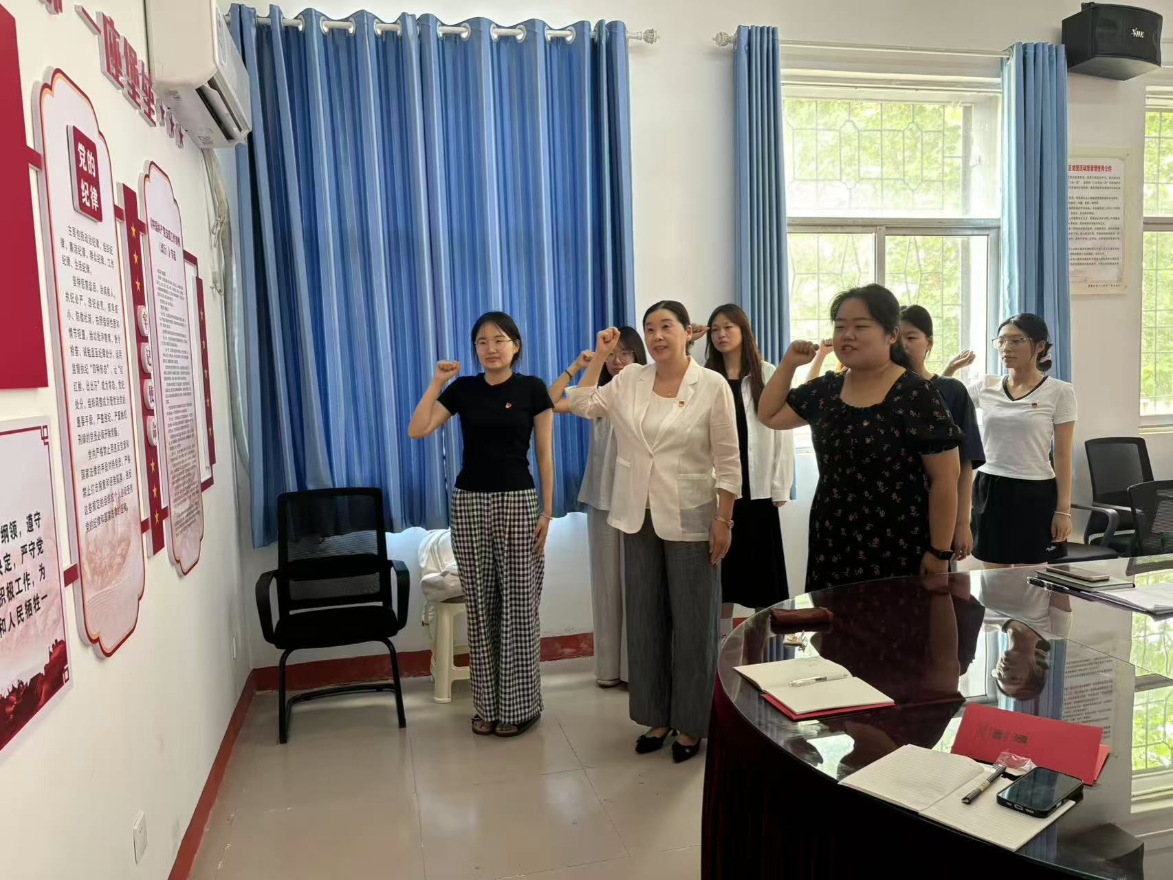 “我志愿加入中国共产党,拥护党的纲领,遵守党的章程,履行党员义务,执行党的决定……”,全体党员面向党旗,高举右拳,共同宣誓,重温庄严神圣的入党誓词,在铿锵的誓言中初心受到洗礼,信念更加坚定。