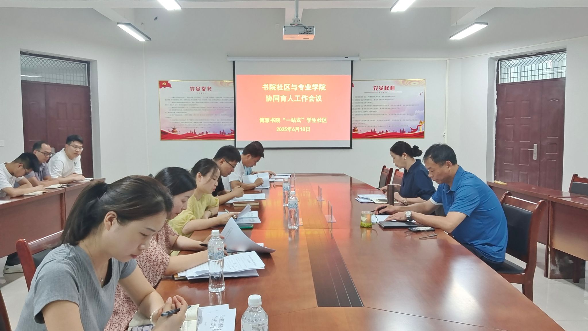 为了进一步推进博雅书院 “一站式”学生社区建设提质增效,6月18日,博雅书院社区会同文史与传媒学院、外国语学院、数理学院、体育学院、医学院等5个专业学院召开本学年第七次协同育人工作会议。博雅书院社区班子成员、入住书院社区学院党委副书记、团委书记,博雅书院社区科级干部、辅导员等参加会议。会议由博雅书院院长王建民主持。