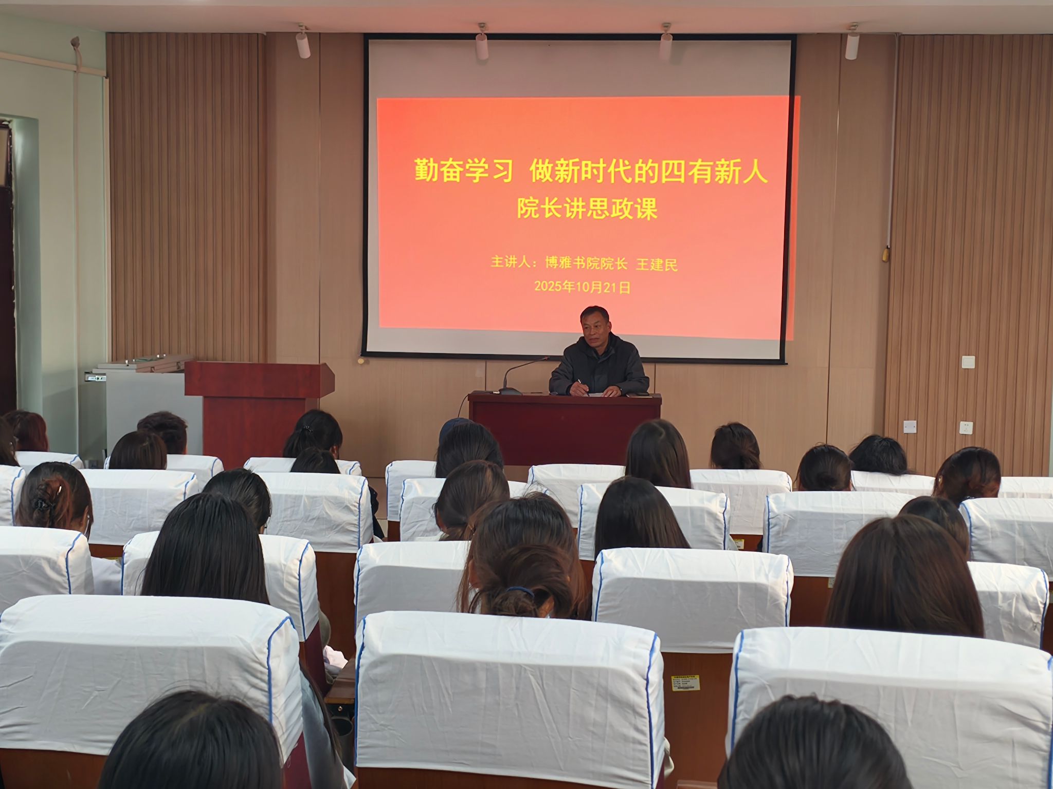 10月21日下午,博雅书院党委书记李俊杰、院长王建民分别以《以信仰之光,照亮时代征程》、《勤奋学习,做新时代的四有新人》为题为学生讲授思政课,学生代表80余人聆听讲座。