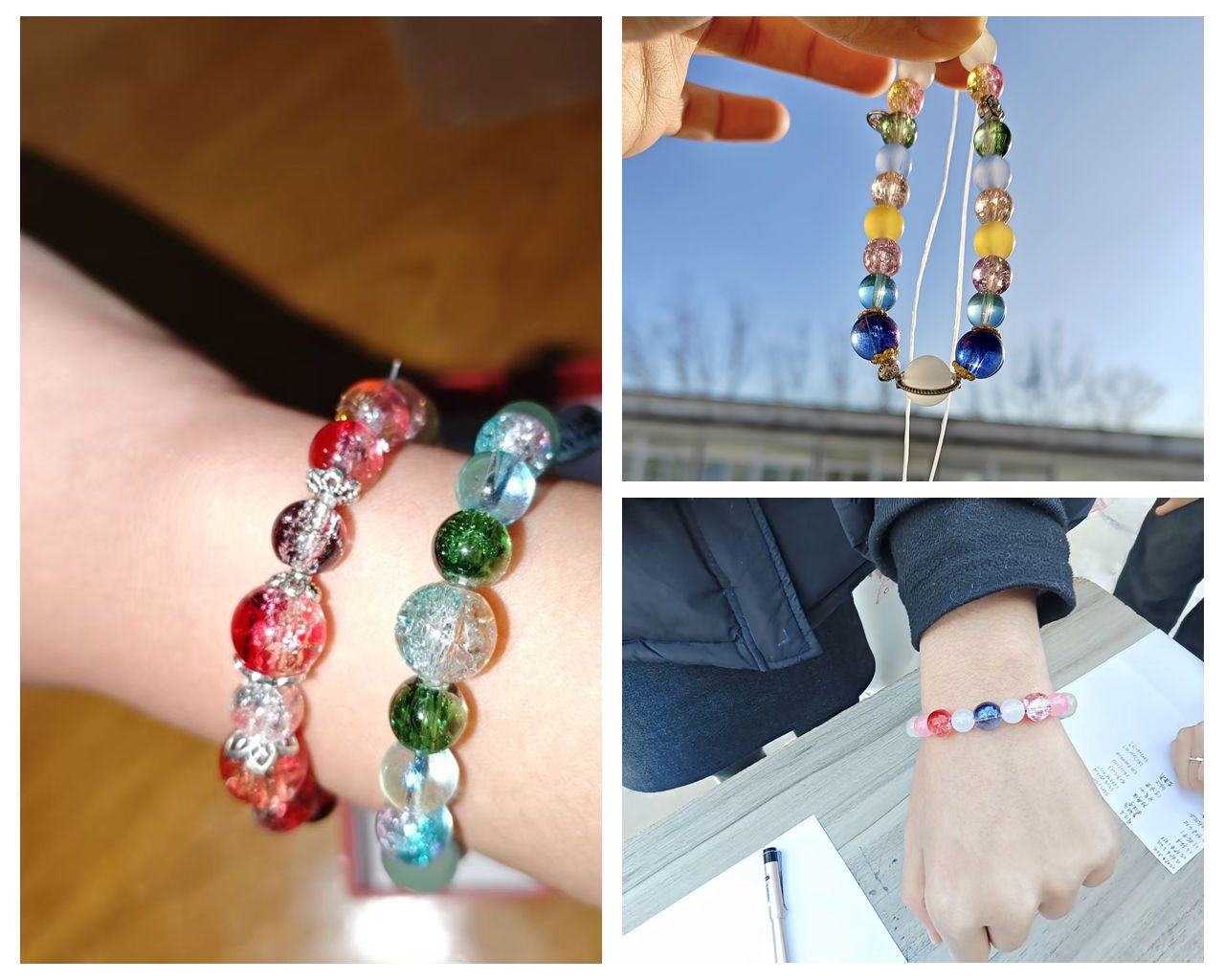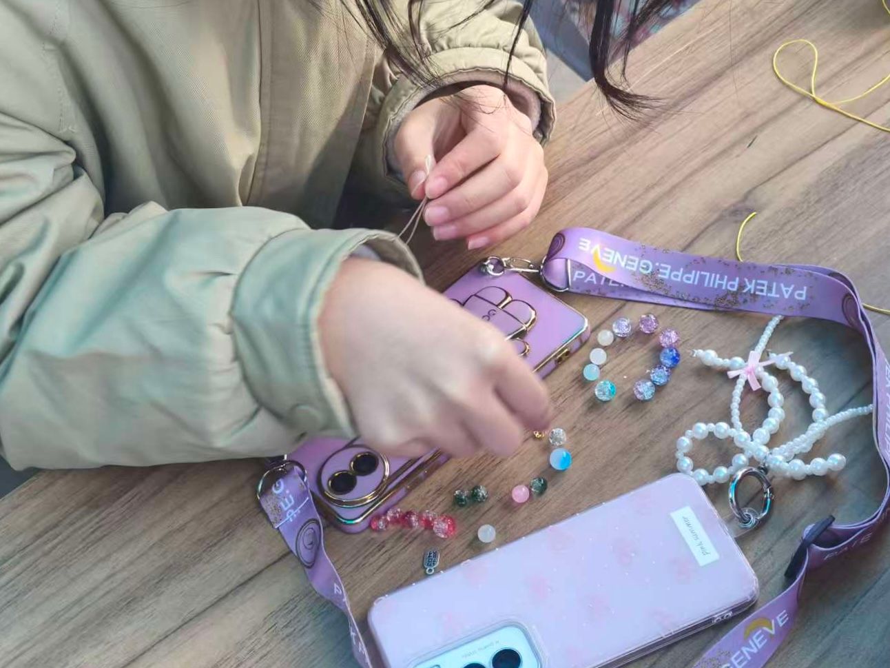 活动现场,琳琅满目的串珠、线材等材料被整齐地摆放开来,营造出一种温暖而富有创造力的氛围。参与者们围坐在一起,或独自思考,或三两交流,挑选着心仪的配件,开始了自己的创作之旅。