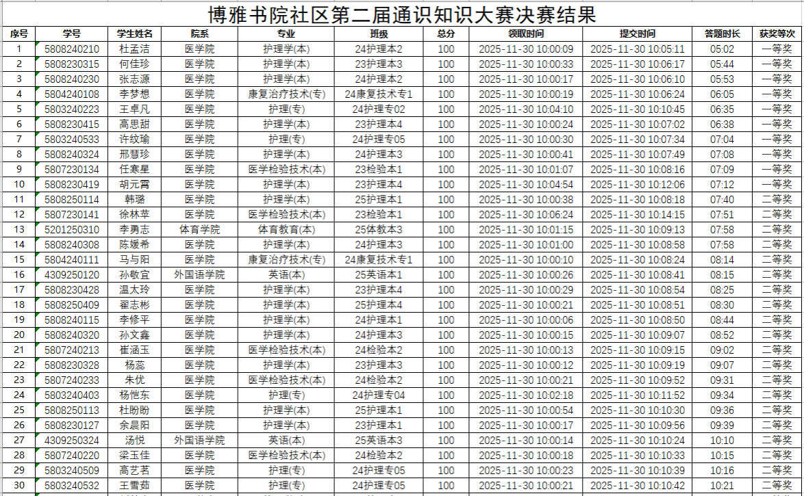 11月30日上午10点整,博雅书院社区第二届通识知识大赛决赛正式在学习通平台开赛,我书院社区学生共有120人参加决赛。最终,根据参赛学生答题成绩和答题时间,评出一等奖10名、二等奖20名、三等奖30名、优秀奖22名。