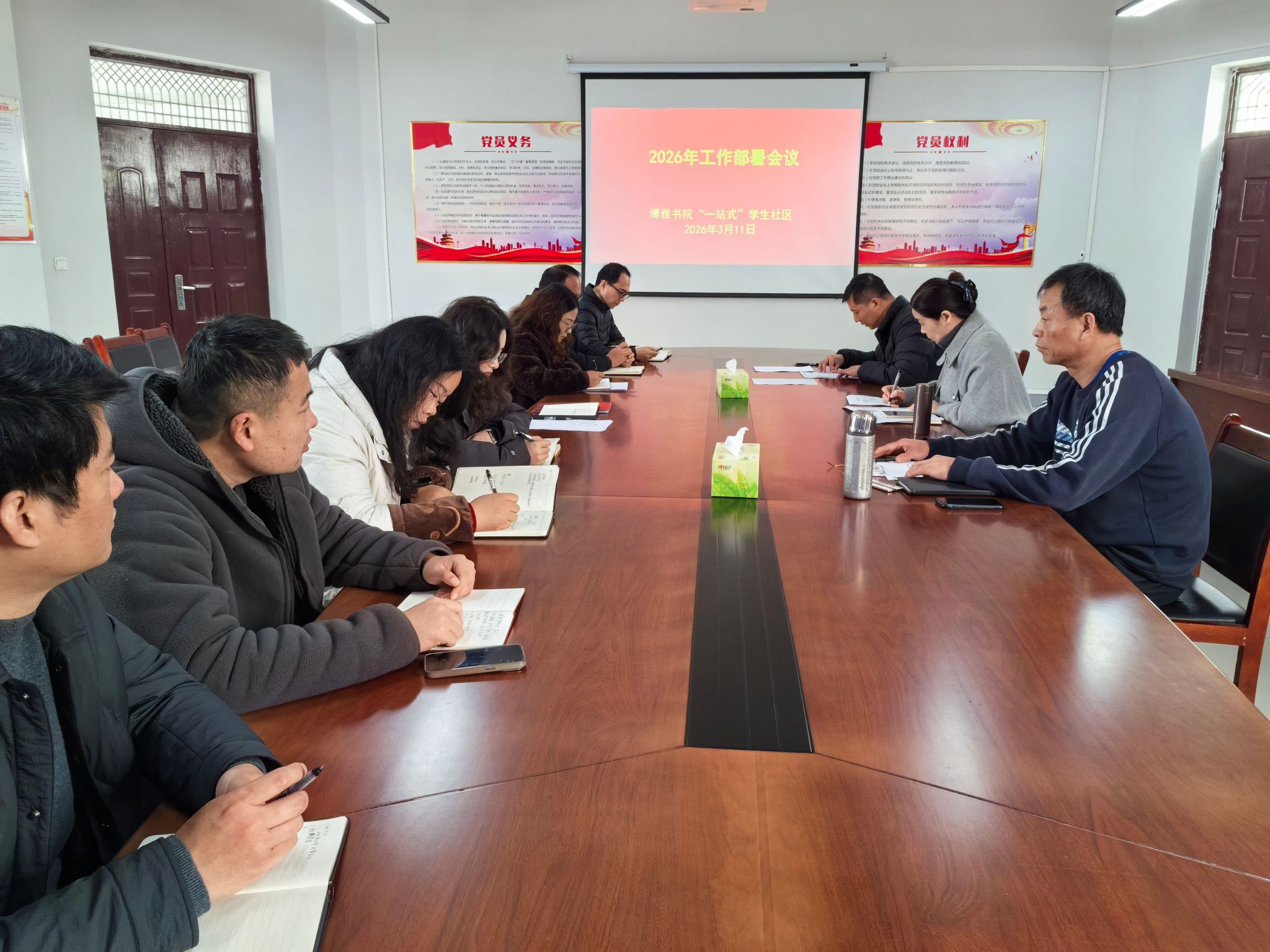 3月11日,博雅书院“一站式”学生社区在书院会议室召开2026年工作部署会议。书院社区党委书记李俊杰,院长王建民,党委副书记、副院长陶战刚以及书院社区科级干部和全体辅导员参加会议,会议由李俊杰主持。