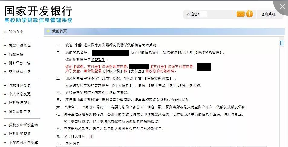 2.在系统首页面查看还款专用的支付宝号、初始登录密码和初始支付密码;