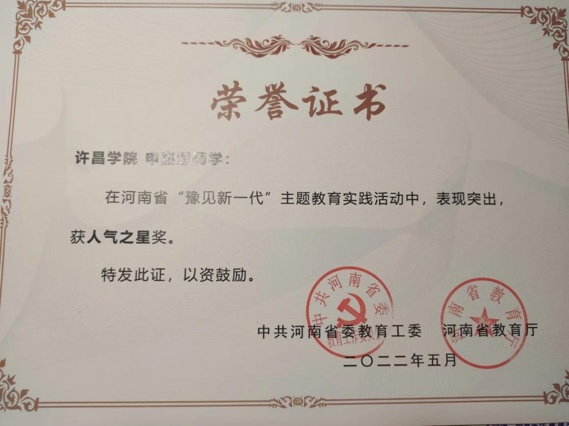 她积极进取,勤奋努力,在大一下学期,获得了“优秀共青团员”称号。她参加了由河南省教育厅举办的“豫见新一代”主题教育实践活动,在该活动中表现突出,获得人气之星奖。