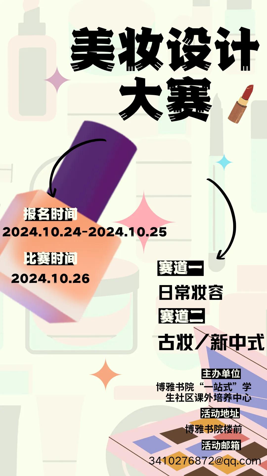 为丰富校园文化生活,提升同学们的审美能力和艺术修养,博雅书院“一站式”学生社区课外培养中心将于近期开展“妆点青春 育践美丽”第一届美妆设计大赛,我们诚挚邀请所有对美妆感兴趣的同学积极参与,展示你的创意与才华!
