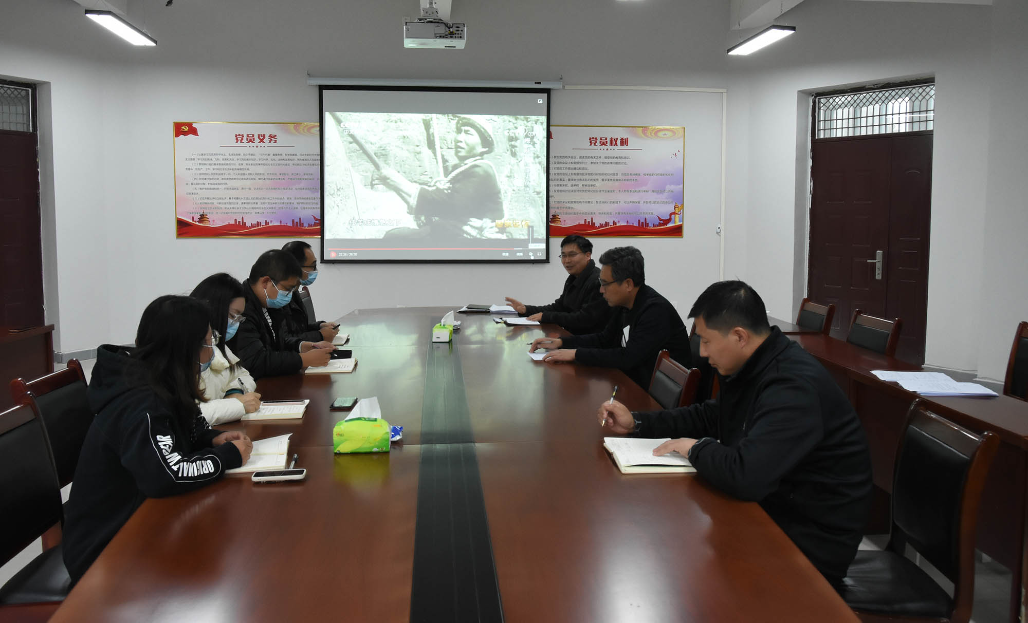 各党支部书记组织党支部全体党员参与会议,观看中央电视台《国家记忆》栏目播出的专题片《根脉——红旗渠精神》。会上,党支部书记领学了习近平总书记视察安阳重要讲话精神,同时与会党员围绕“自力更生、艰苦创业、团结协作、无私奉献”红旗渠精神的内涵展开深入讨论与交流。