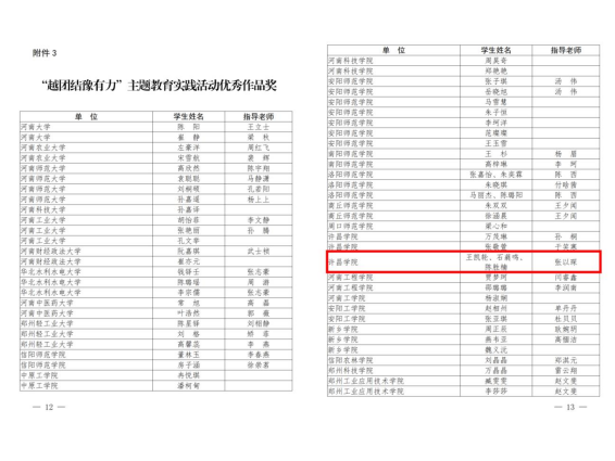 4月10日中共河南省委教育工委办公室、河南省教育厅办公室公布了“越团结豫有力”主题教育实践活动获奖结果,我院师生在活动中获得多项荣誉,20级护理专业学生陈胜楠所创作的作品荣获活动“优秀作品奖”,22级法学专业学生李思宇、21级护理专业学生马青峰所创作的作品荣获活动“人气之星”,辅导员魏笑、罗楠被评为优秀指导老师。