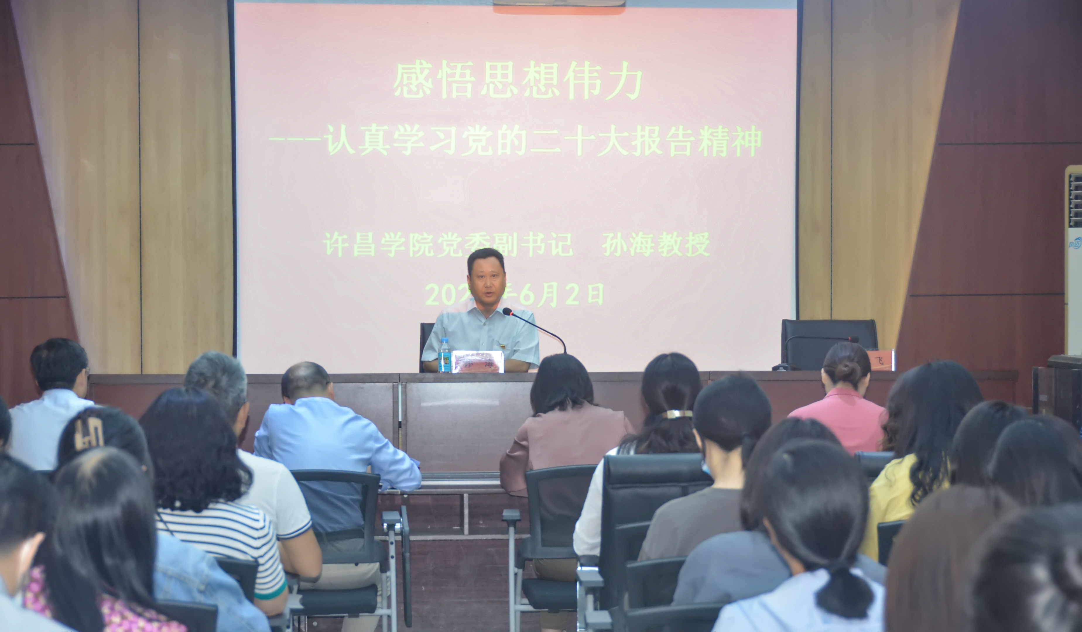 为深入贯彻落实党的二十大精神,扎实推动学习贯彻习近平新时代中国特色社会主义思想主题教育走深走实,6月2日下午,我院特邀许昌学院党委副书记孙海教授为博雅书院、医学院师生作“感悟思想伟力——认真学习党的二十大报告精神”专题辅导报告。会议由医学院党委书记吴飞主持,博雅书院党委、医学院党委全体教工党员、学生代表共同参加学习。