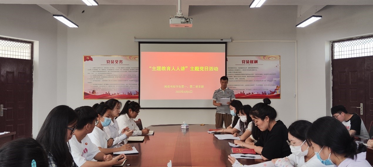 为持续推进学习贯彻习近平新时代中国特色社会主义思想主题教育走深走实,6月6日,博雅书院学生第一、第二党支部在党建活动室联合开展“主题教育人人讲”主题党日活动,学生第一党支部书记贺琴作专题党课,学生第一、第二党支部全体党员参加活动。