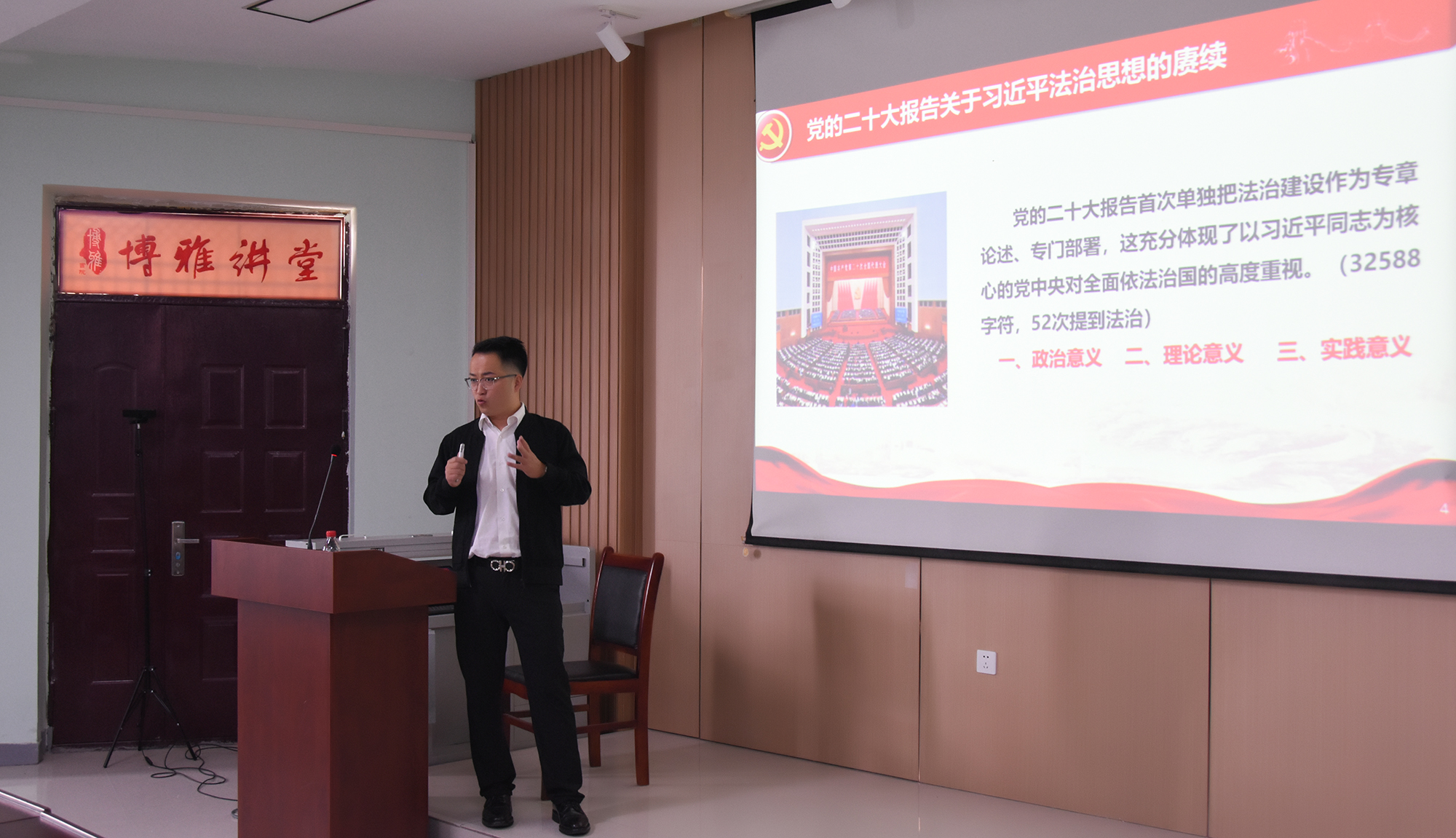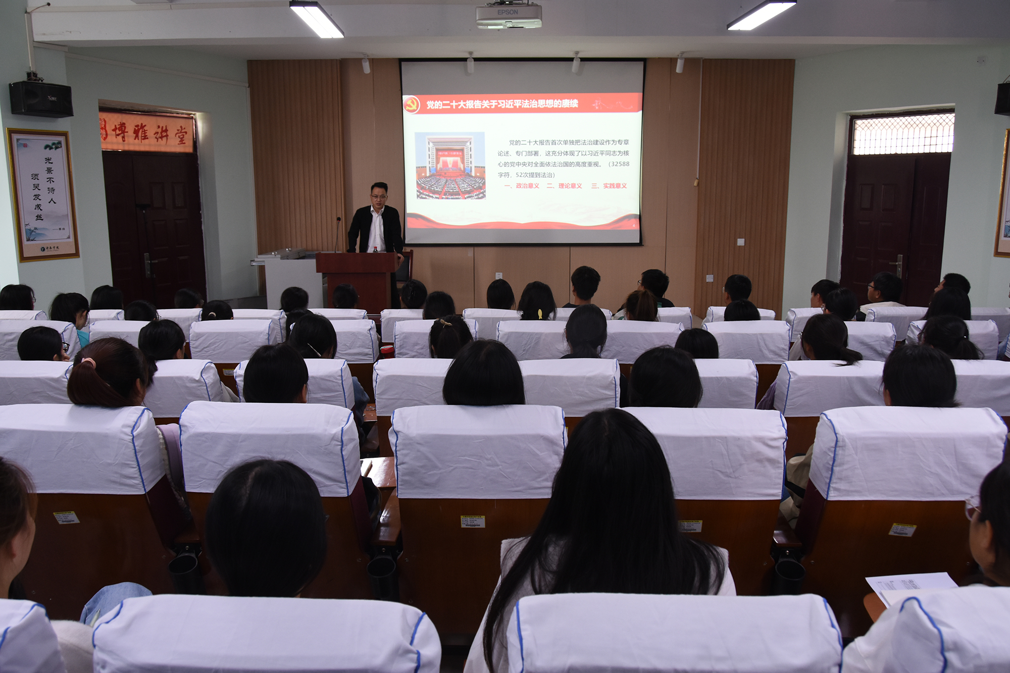 孙敬良博士从习近平法治思想的形成发展、生成逻辑、原创贡献和学习要求等四个方面展开了专题讲授,重点讲授了习近平法治思想的提出背景、生成逻辑、核心要义以及对中华优秀文化的创造性转化和创新性发展。他用生动有趣的语言,一个个打动人心的伟人故事,以及鲜活真实的事例,向现场学生深入浅出地讲述了习近平法治思想。同时,他勉励大家要努力学习专业知识,坚持积极作为,坚持“听党话,跟党走”,深刻领悟“两个确立”的决定性意义,进一步增强“四个意识”、坚定“四个自信”、做到“两个维护”,争做新时代的奋斗者,为祖国的繁荣昌盛贡献自己的一份力量。
