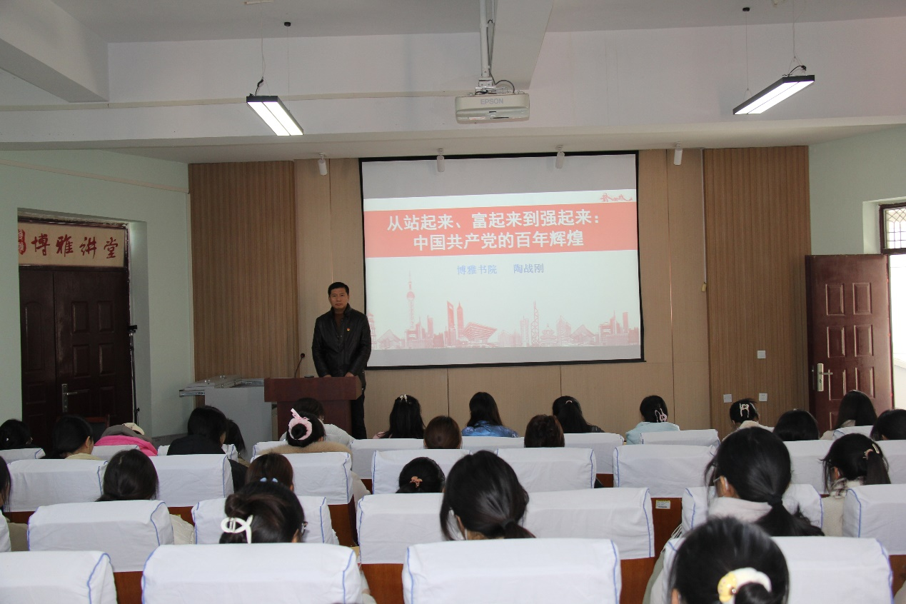 党委副书记、副院长陶战刚以“中国共产党的百年辉煌”为题,引导学员们继承发扬共产党人的精神血脉,不断丰富共产党人的精神谱系,书写中国共产党人新的精神史诗,让共产党人的崇高情怀放射出新的时代光芒。