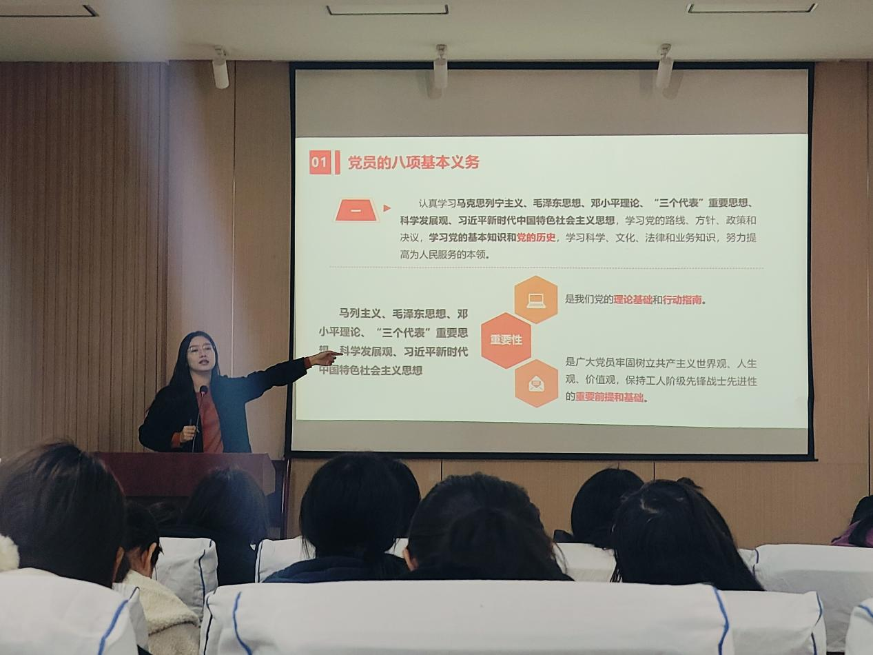 沈祺从认真履行党员义务、正确行使党员权利、辩证统一地认识党员的义务与权利这三个方面进行阐述。她指出,党员的义务就是党员对党应尽的责任,是党对党员的基本要求,是党员条件的具体化,也是衡量一个党员合格不合格的具体标准。党员的权利指党员按照党章规定应享有的党内的各项权利,是我们党党内民主的具体体现。我们要辩证统一地认识党员的义务与权利,规定党员义务和权利的重要性与必要性,正确认识党员义务和权利的关系。她强调入党积极分子应以党员的标准严格要求自己,从学习、生活、工作中不断努力,在各个方面起到先锋模范带头作用,争取早日成为一个合格的共产党员。