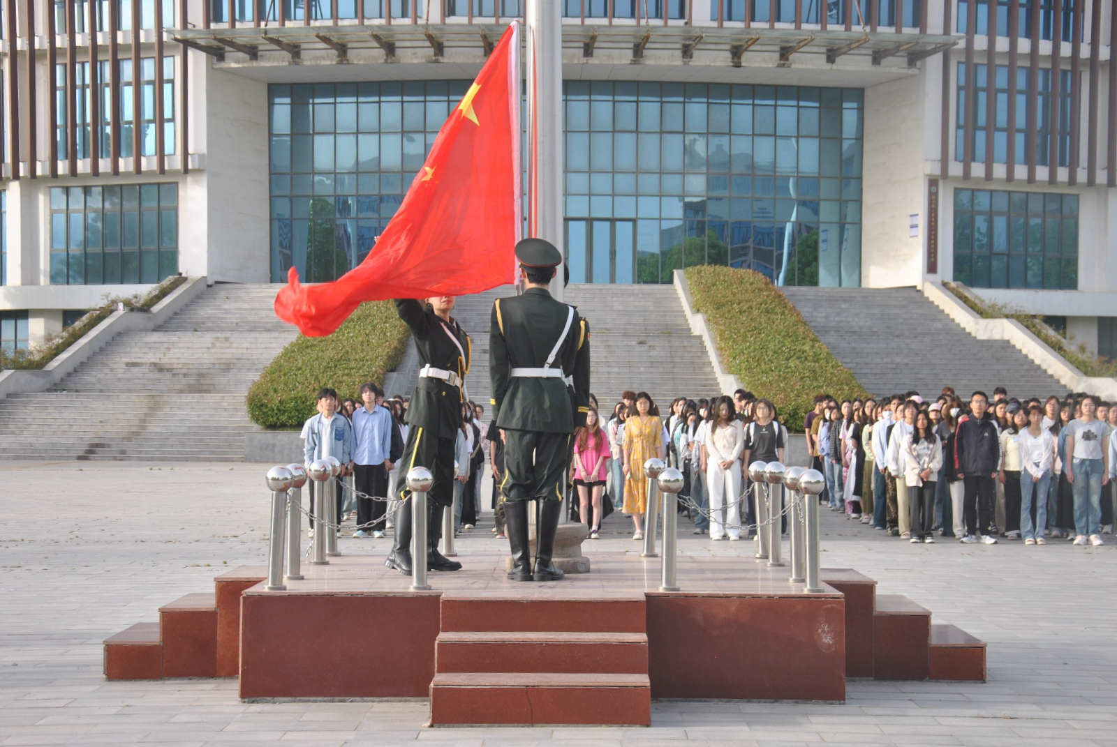 2025年5月6日,博雅书院“一站式”学生社区在兴华路校区图书馆前举行升国旗仪式暨“国旗下的誓言”主题教育活动。参与此次活动的有博雅书院团委书记贺琴、外国语学院辅导员李圆圆、外国语学院2024级新生以及国旗护卫队队员。