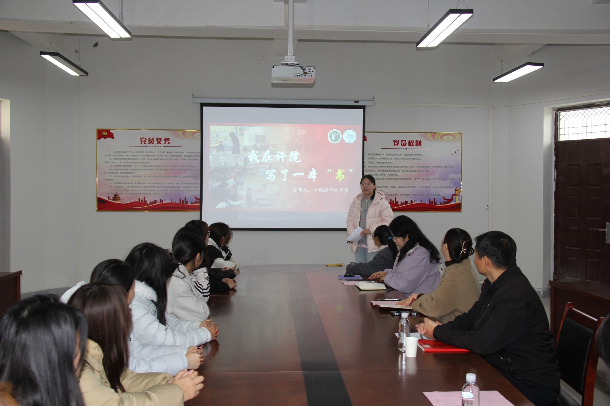 外国语学院大学生党员标兵李晨以“我在许院写了一本‘书’”为题分享了个人成长故事,她从思想引领—青矜之志践志远、学业精进—勤思善学立标杆、实践担当—知行合一绽芳华三个方面展开讲解,鼓励在场同学努力学习、勤于思考、积极实践,做有本领、有担当的新时代大学生。