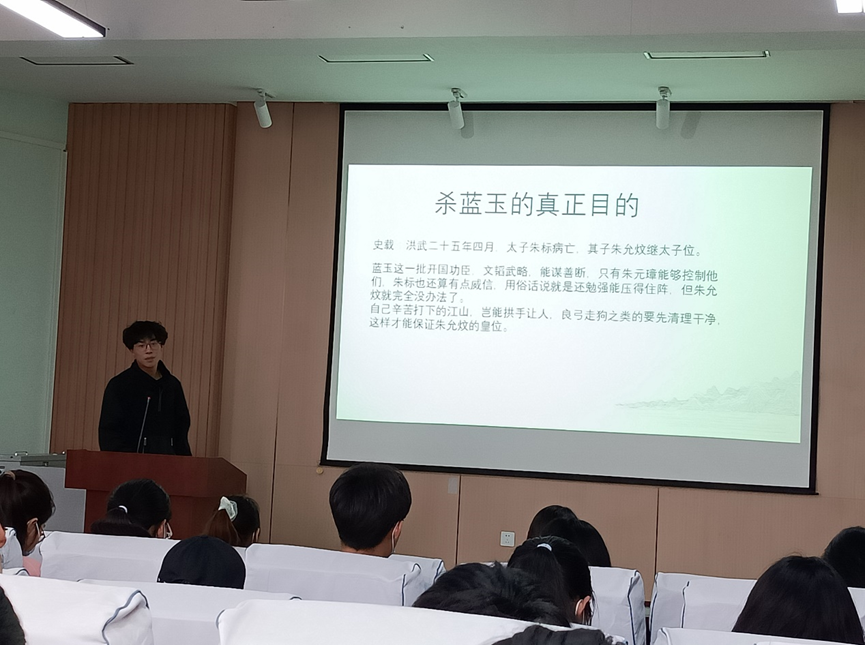 4月29日下午,2020级药学专业李昊航和韩景超两位同学在博雅讲堂,继续讲述明朝的故事第三期:朱元璋重典治国。