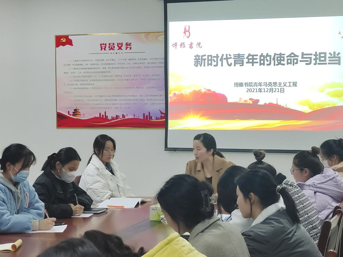 12月21日,我院在博雅书院201党建活动室开展“新时代青年的使命与担当”专题讲座。博雅书院团委副书记姚婷玉及青年马克思主义者培养工程全体学员参加讲座。