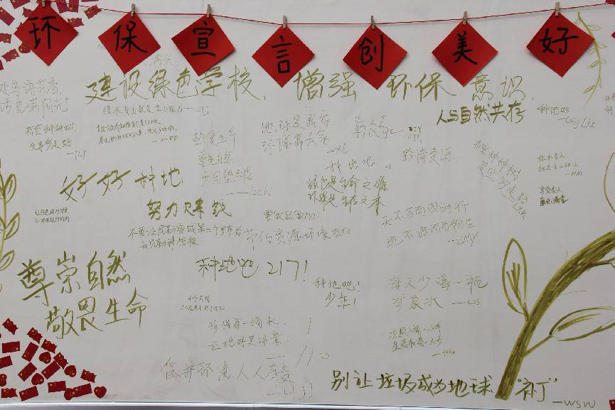 书院社区特设置环保宣言签名墙活动,学生们纷纷拿起马克笔,在由废旧纸板拼接而成的背景板上签下自己的名字和环保承诺,将内心所愿写在纸板之上,展示在博雅书院楼前,激励更多同学践行环保行动。