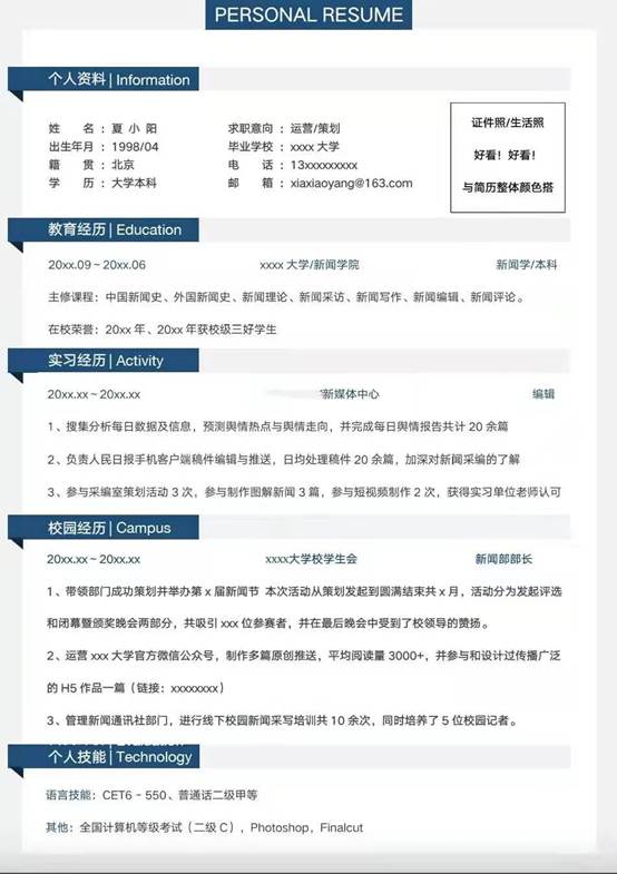 5.照片用证件照或者好看的他拍照,与简历主色调协调即可,不要放带着贴纸的自拍照,简约大方是标准。
