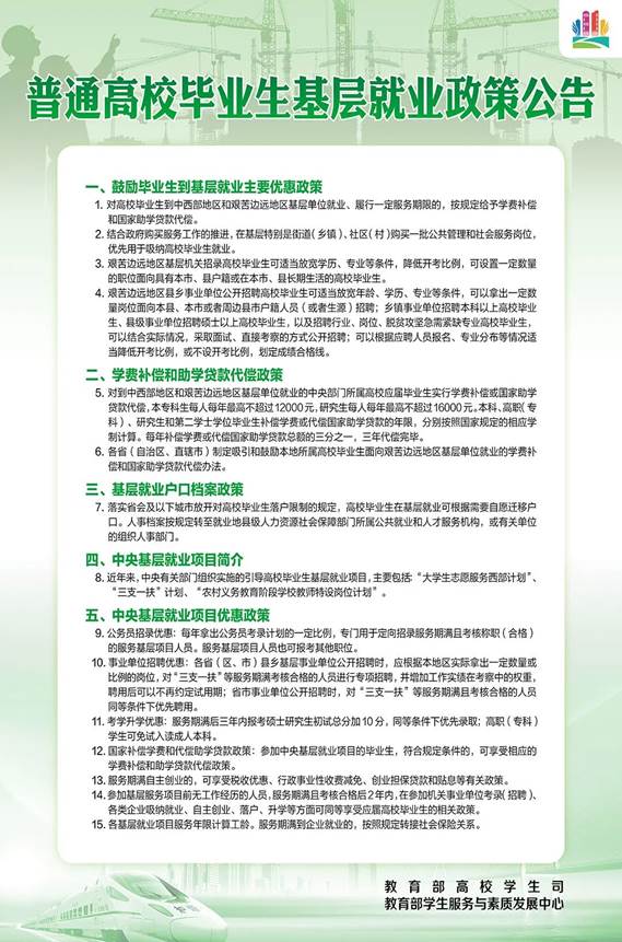 12.国家补偿学费和代偿助学贷款政策:参加中央基层就业项目的毕业生,符合规定条件的,可享受相应的学费补偿和助学贷款代偿政策。