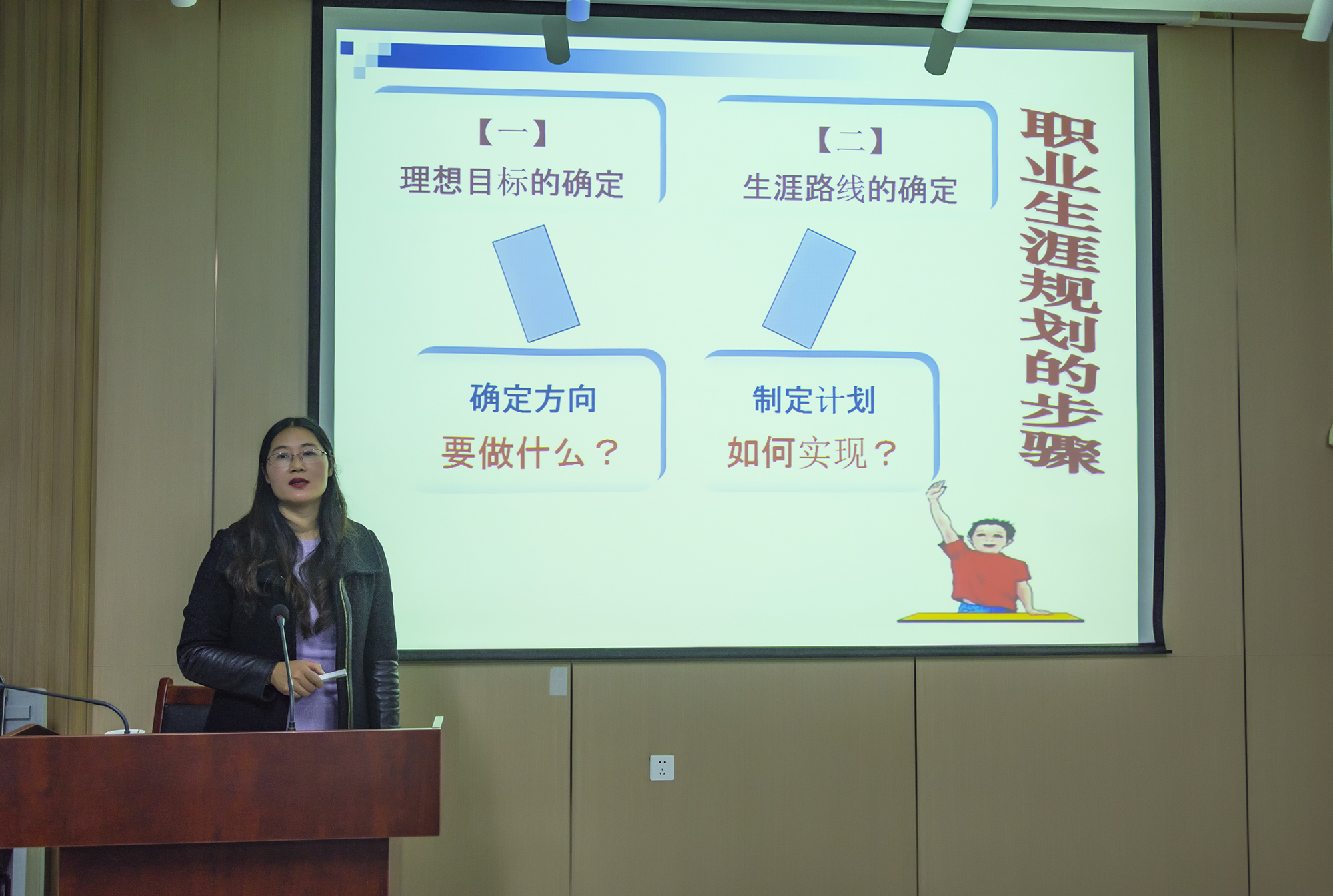 陈丽平副院长从职业生涯规划的含义、意义和原则三个方面展开阐述。她在讲座中指出,职业是谋生的手段,可以提供参与社会的机会,能够体现自身价值。职业生涯规划应结合自身条件和现实环境,确立自己的职业目标,选择职业道路,制定相应的个人成长计划,并按照生涯的不同发展阶段实施具体行动。
