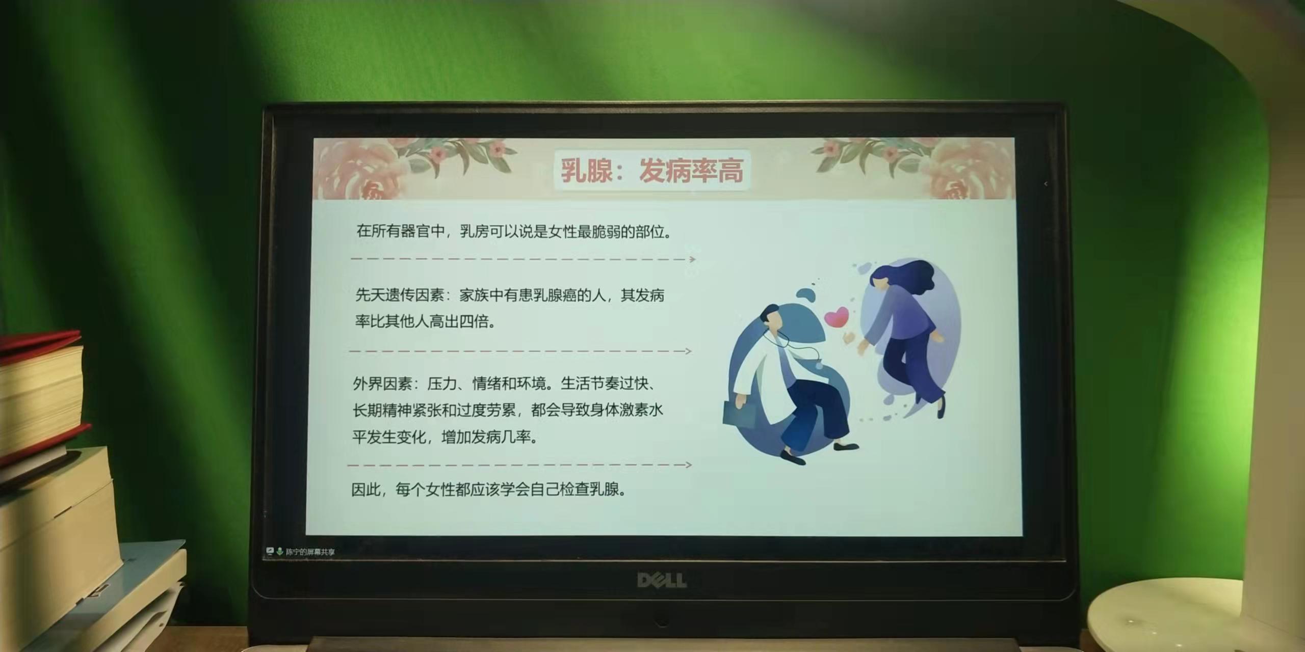 随着社会的发展,生活水平的提高,人们对自身的健康尤其是生殖健康问题也越来越重视。郭梦汝、陈宁、叶苏萌期望通过讲座增进在校学生对女性健康的认识,共同促进全民健康。她们围绕关于女性健康、女性一生六大时期的生理特点、女性健康的“两大杀手”、树立正确观念呵护健康等四个方面展开讲述。
