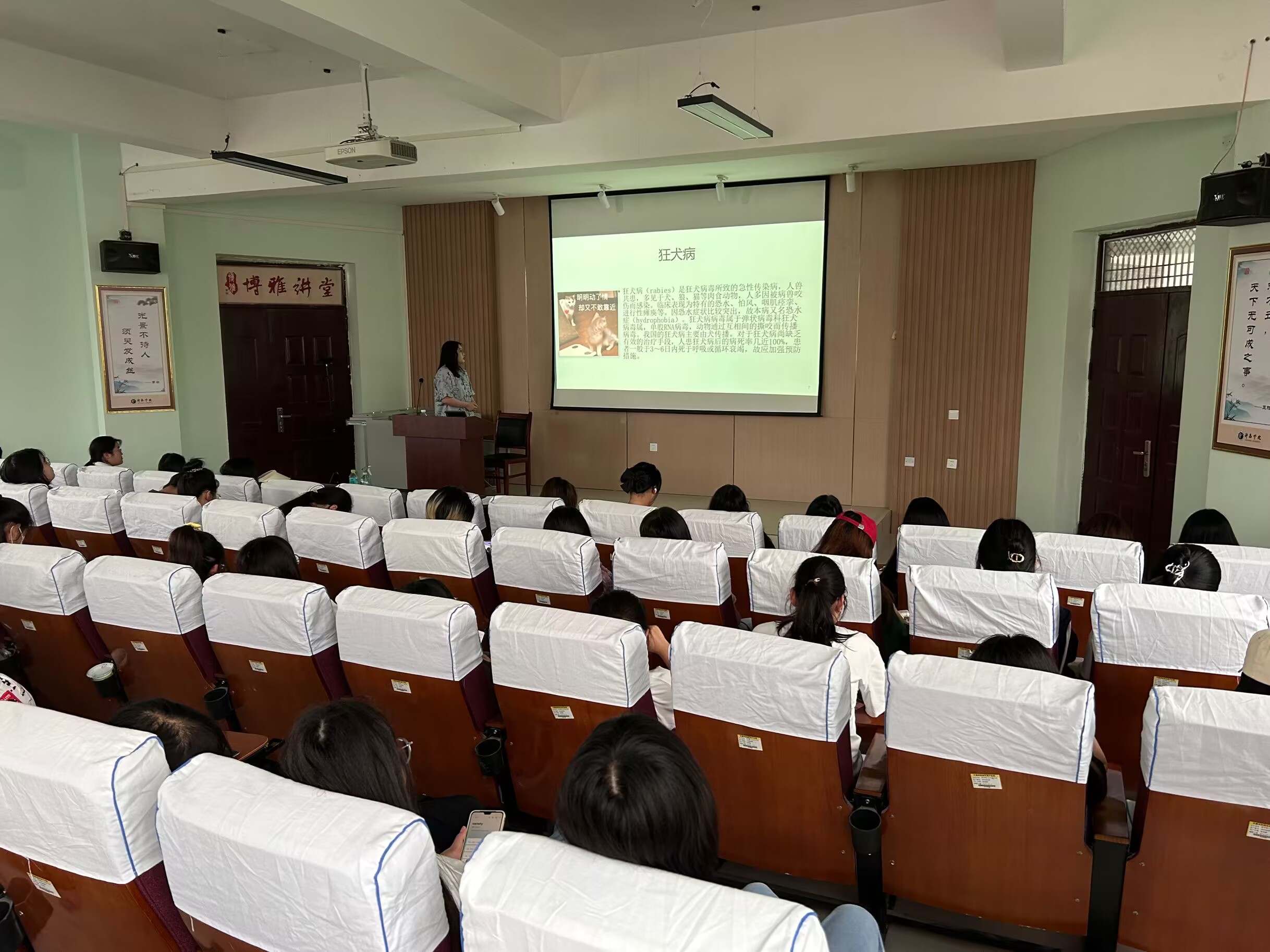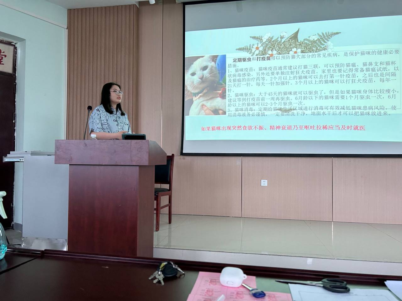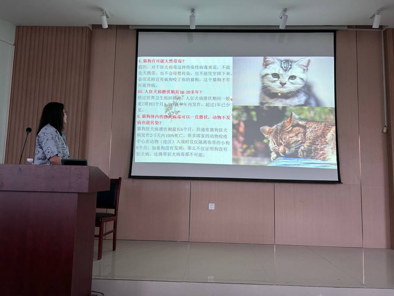 邱雨亭同学首先向大家科普了狂犬病毒的相关知识,狂犬病的临床表现。被猫咪抓伤后是否需要打疫苗,邱雨亭进行了细致的讲解,如果遇到被家养猫咬伤的情况,她推荐采用十日观察法。接着,邱雨亭用视频的方式展示了如何正确在户外诱捕野猫及如何辨别猫咪是否绝育,以此达到和平减少流浪猫的数量,协调人猫关系,营造和谐社会。之后,她讲解了养猫的注意事项、猫粮的选择、猫粮更换的周期、猫常见疾病的防治方法等养猫必备知识。最后,邱雨亭提醒同学们要科学正确养猫,拒绝宿舍养猫。