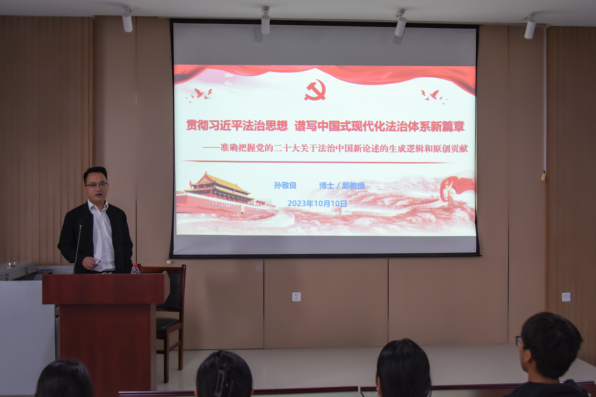 孙敬良博士从习近平法治思想的形成发展、生成逻辑、原创贡献和学习要求等四个方面展开了专题讲授,重点讲授了习近平法治思想的提出背景、生成逻辑、核心要义以及对中华优秀文化的创造性转化和创新性发展。他用生动有趣的语言,一个个打动人心的伟人故事,以及鲜活真实的事例,向现场学生深入浅出地讲述了习近平法治思想。同时,他勉励大家要努力学习专业知识,坚持积极作为,坚持“听党话,跟党走”,深刻领悟“两个确立”的决定性意义,进一步增强“四个意识”、坚定“四个自信”、做到“两个维护”,争做新时代的奋斗者,为祖国的繁荣昌盛贡献自己的一份力量。