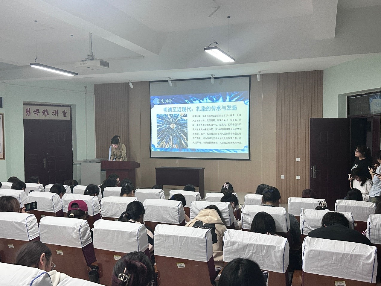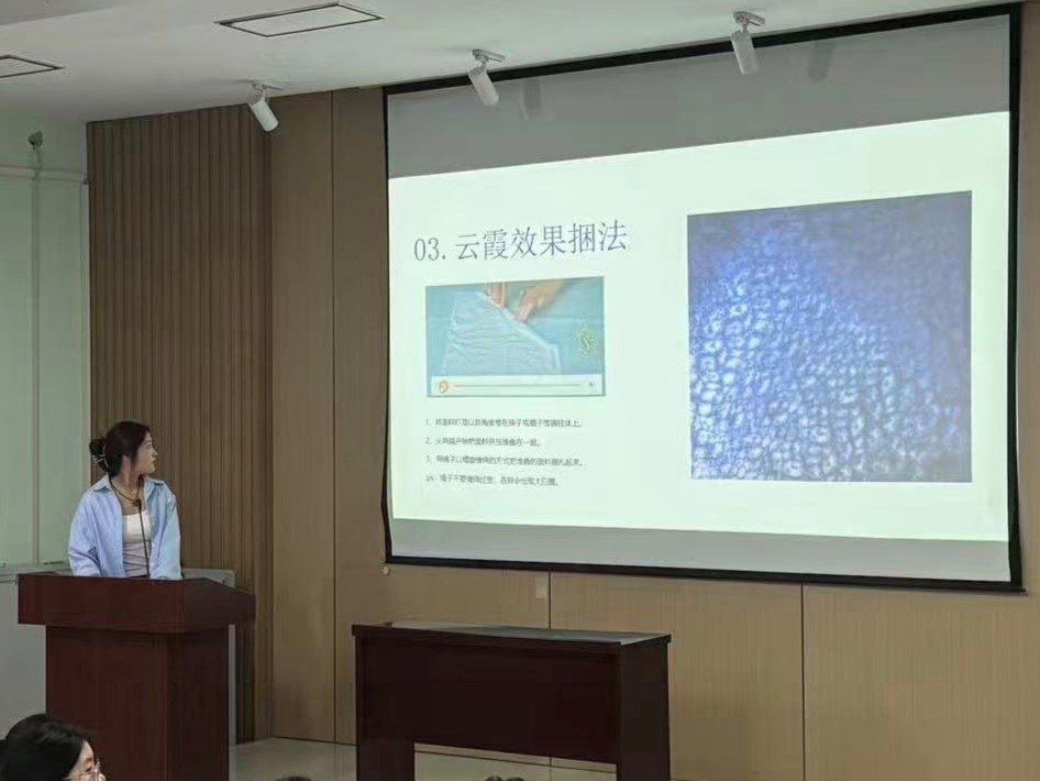 通过崔琳和吴怡霏的图片展示、生动讲解及亲手实践演示,同学们深刻感受到了扎染的魅力,对这一传统手工艺有了更加深入的了解,同时掌握了扎染的基本技能,为他们传承和发展扎染艺术提供了理论和技术支撑。