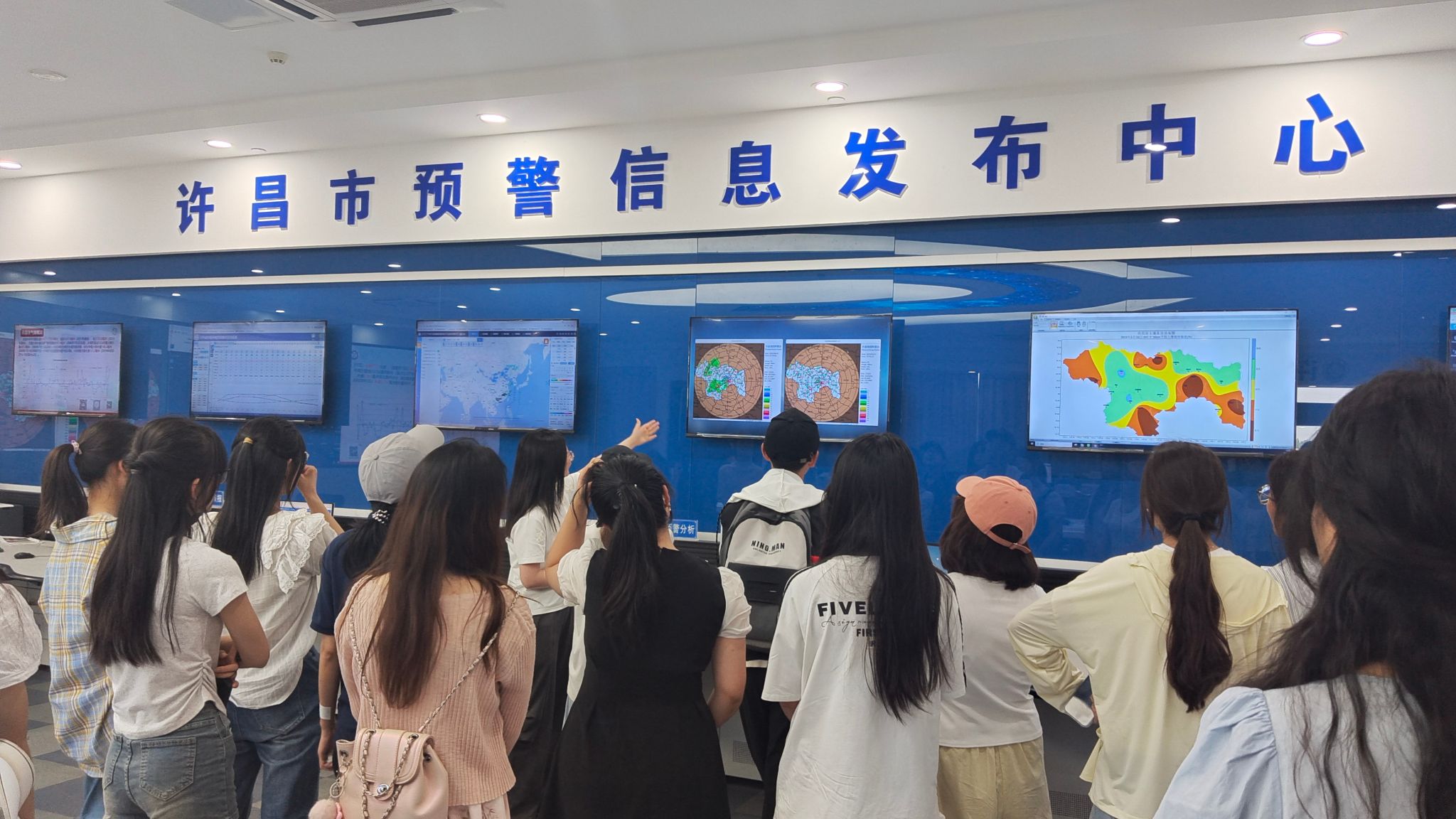 在许昌市气象局李晓凯主任的带领下,同学们参观了气象科普馆雷达塔楼、气象预警信息发布中心、人工影响天气指挥中心、气象影视中心等业务场所,市气象局的专家们为同学们介绍了雷达的工作原理、气象预警信息的预报及推送、人工增雨的流程及作业点分布、天气预报影视的录制等专业气象知识。在参观过程中,同学们就一些特殊天气现象提出问题,气象专家一一作了解答。在气象影视中心,按照气象局专家的要求,同学们走进演播录制大厅,体验了天气预报主持人的工作。