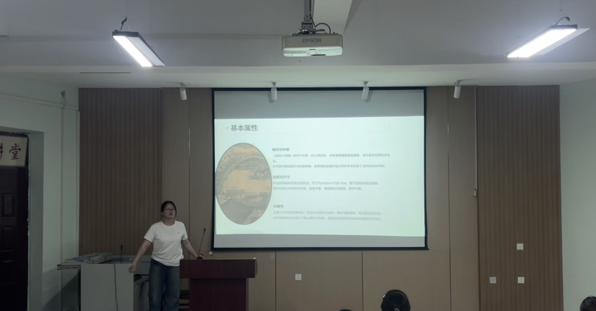 梁玉佳同学从《清明上河图》的基本属性讲起,结合丰富的图文资料,对其历史背景、创作年代进行了深入介绍。她着重讲解了这幅作品的艺术特色与技法。《清明上河图》采用散点透视法,分段呈现郊野、汴河、城市街景,空间布局合理,画面疏密有致,运用工笔重彩技法,线条精细,色彩丰富,对人物、建筑、船只等细节进行了精湛描绘,还以赭石、墨绿、浅黄为主色调,让画面古朴典雅又富有视觉效果。